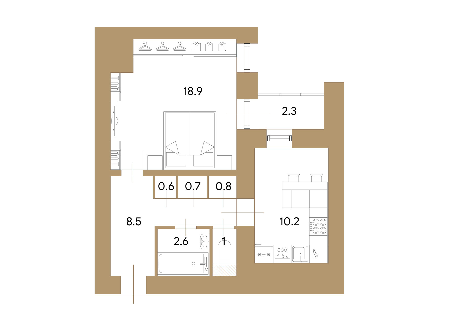 Кухня - столовая 10.2 кв.м. с возможностью разделения на зону готовки и приёма гостей. Спальня 18.9 кв.м. с местом под гардероб и с выходом на остекленную лоджию 2.3 кв.м., которая может служить дополнительным пространством для отдыха, хобби или хранения вещей. Прихожая  8.5 кв.м с тремя встроенными шкафами. Санузел раздельный. В квартире выполнен косметический ремонт.