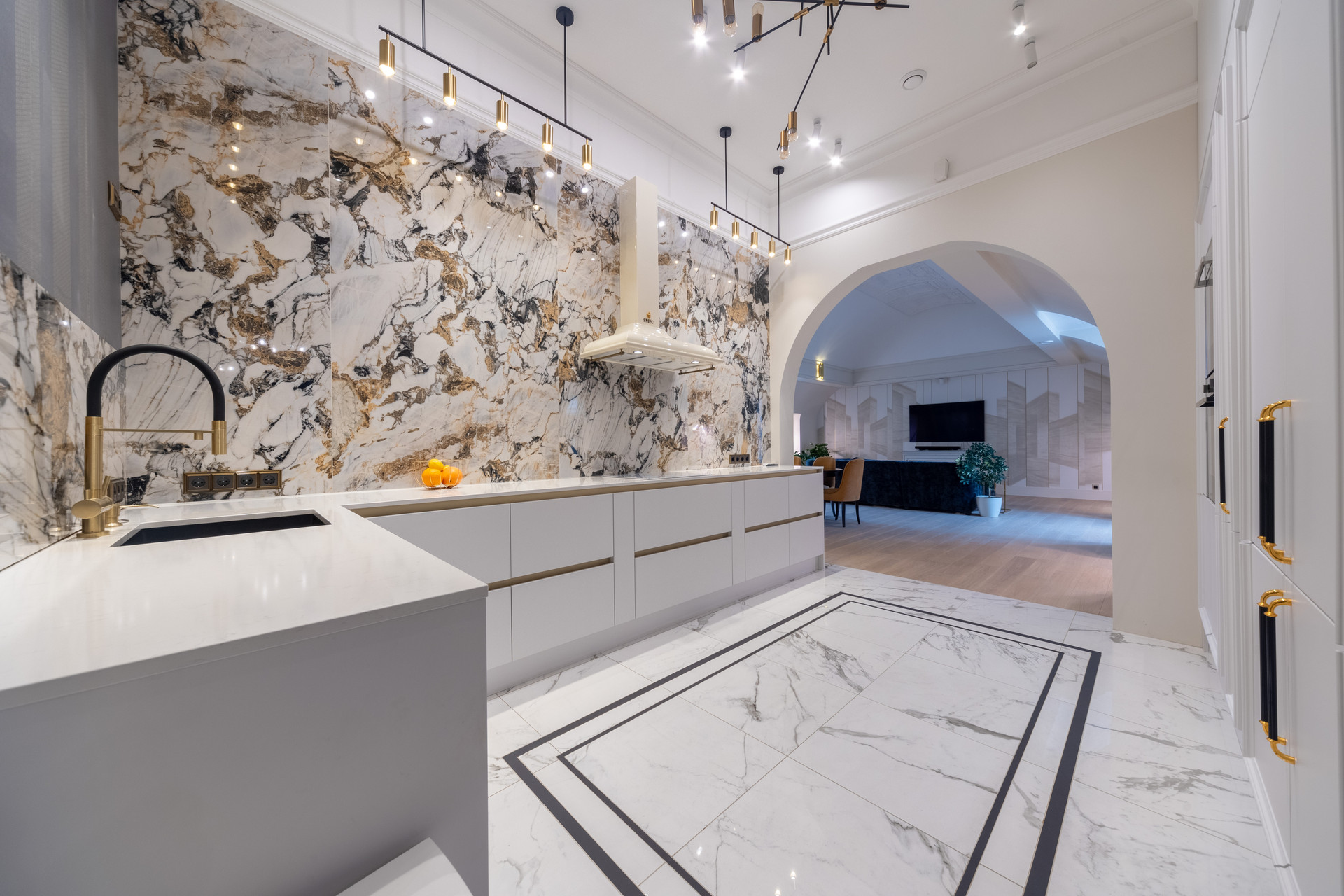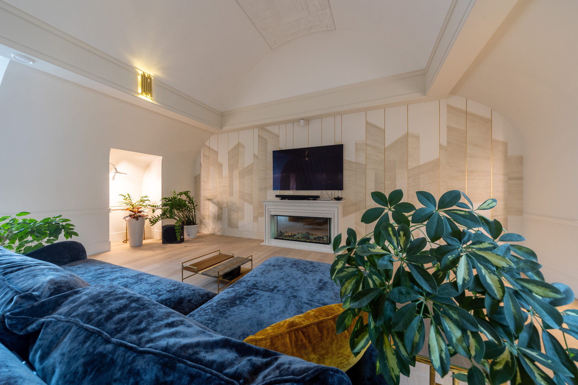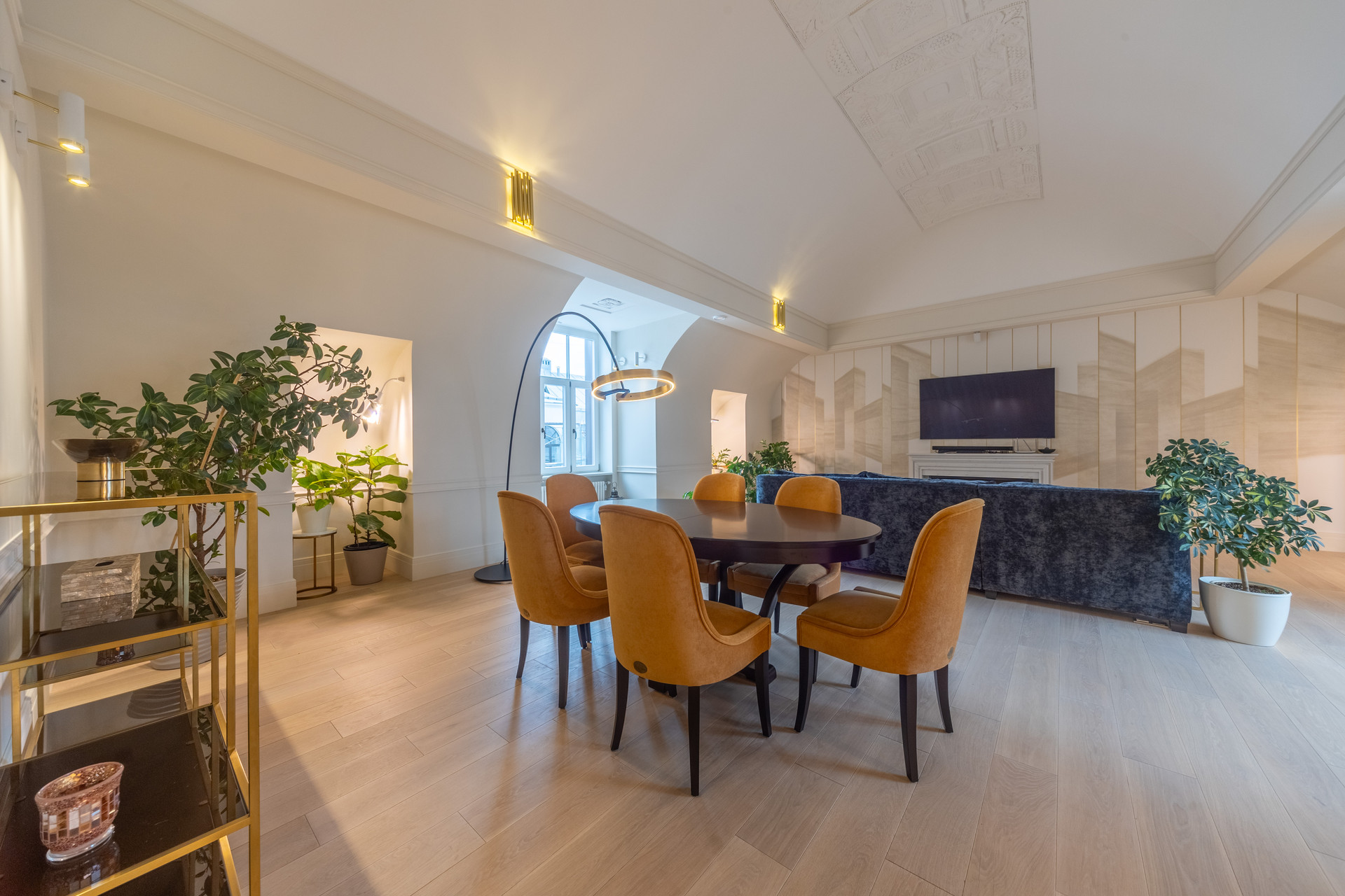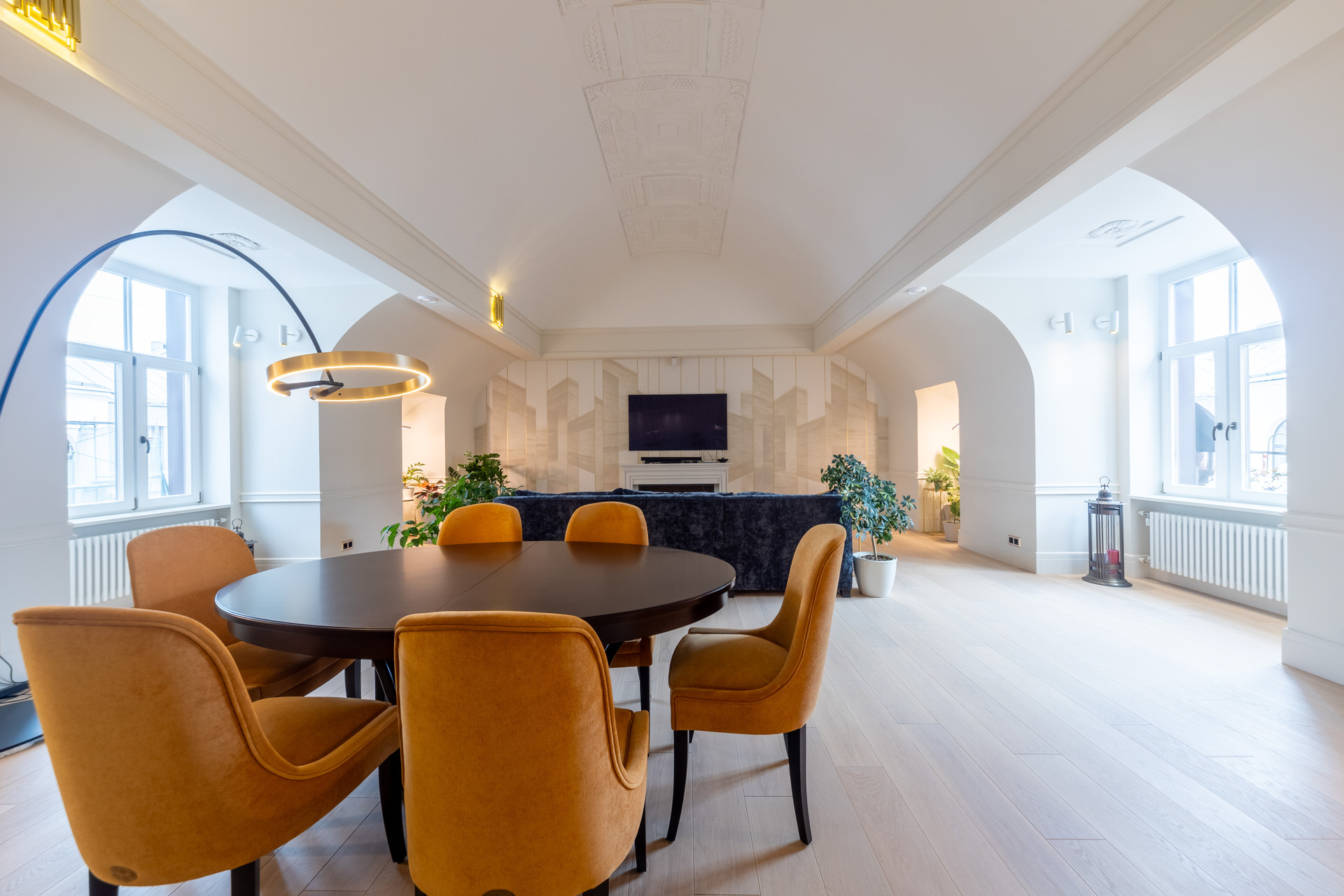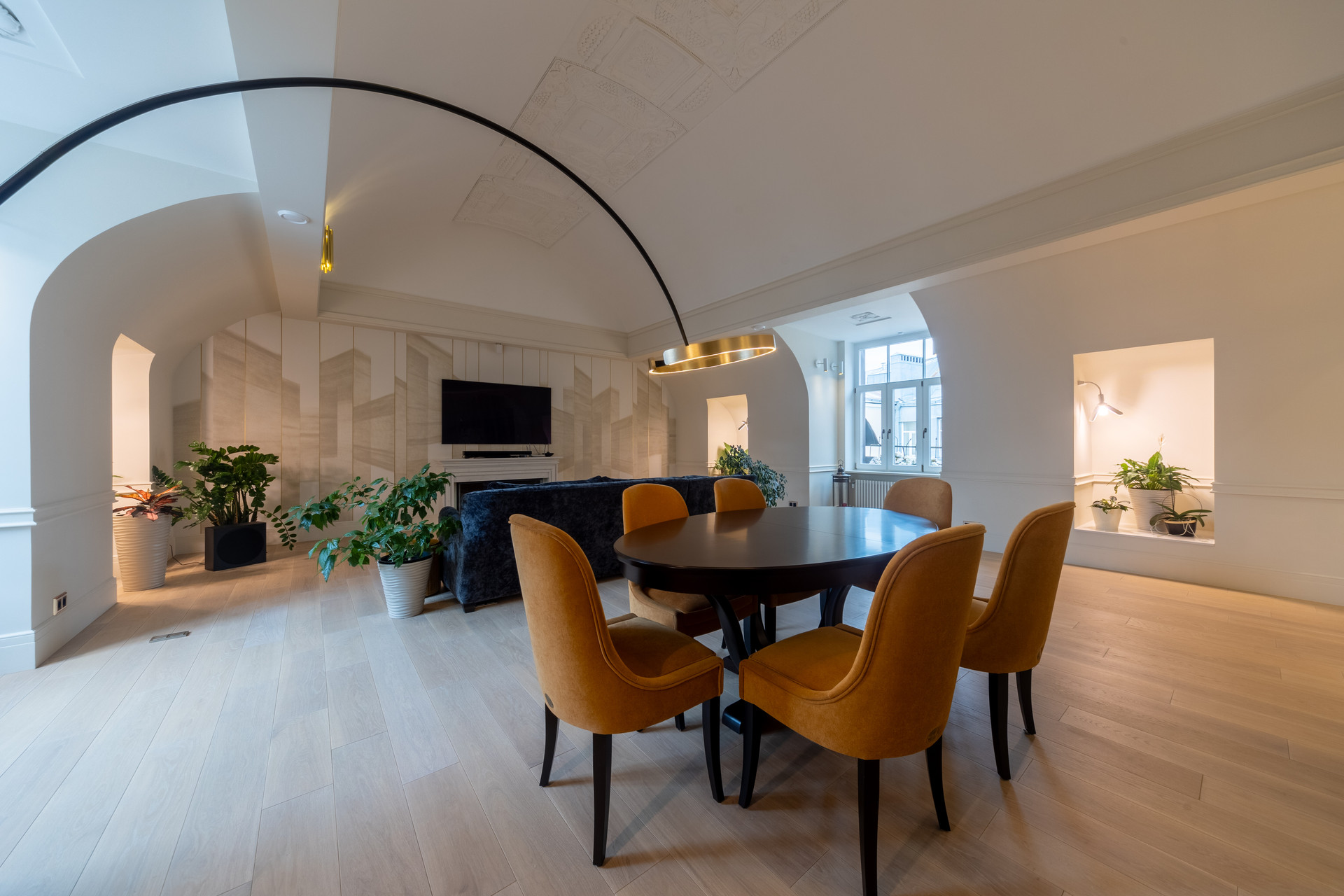 Просторная гостиная с арочными сводами и электрокамином