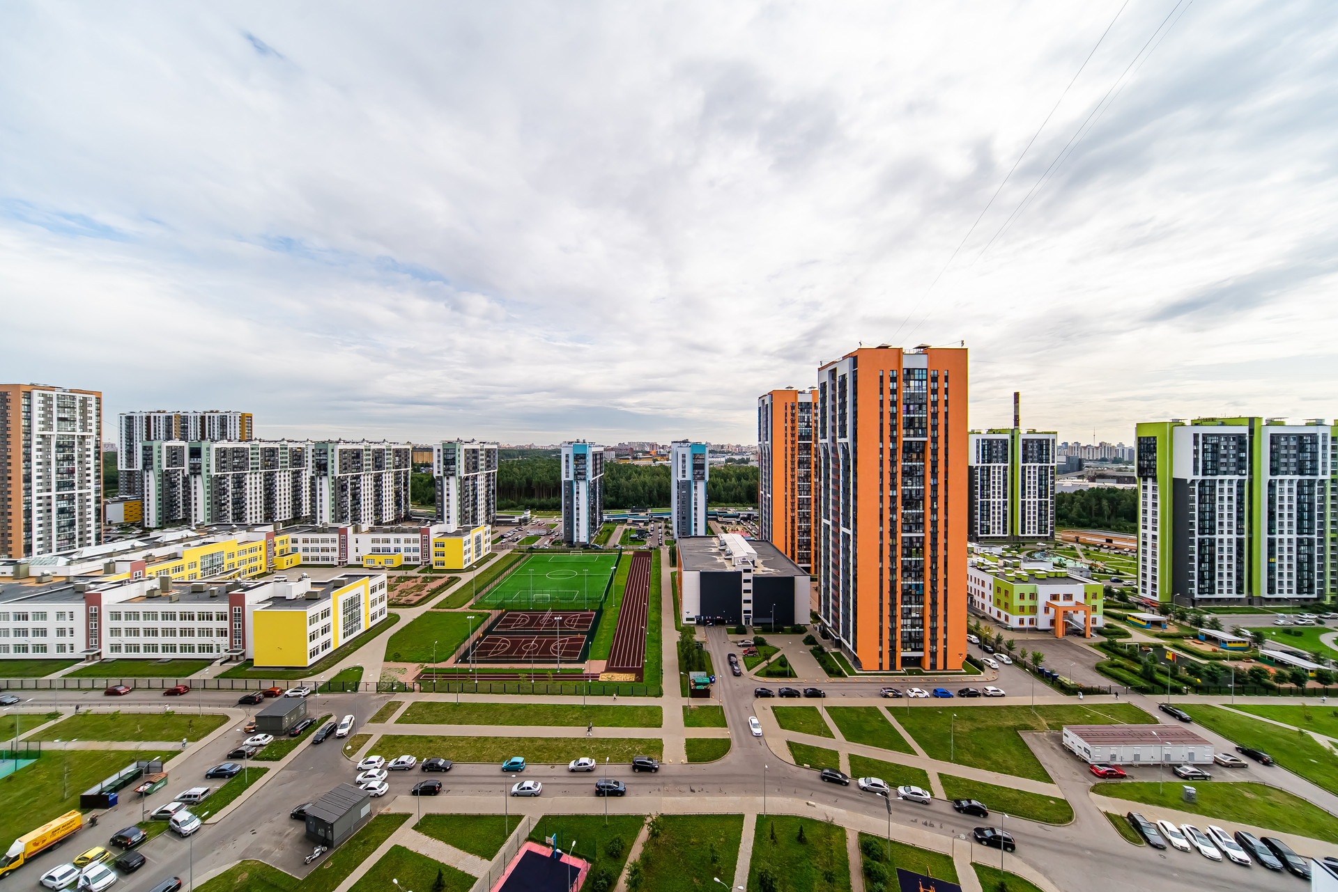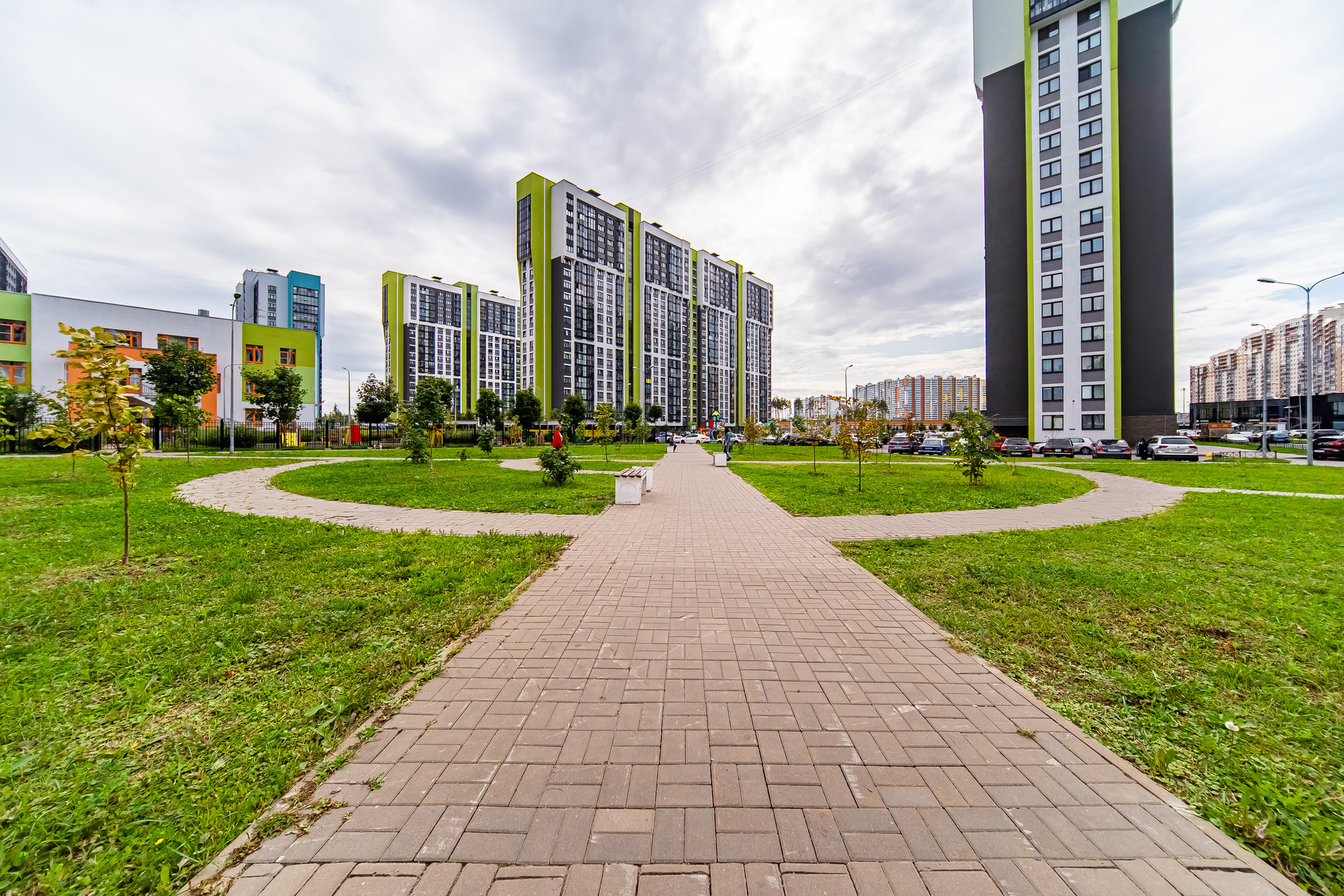 -Яркие, разнообразные детские и спортивные площадки во дворе.