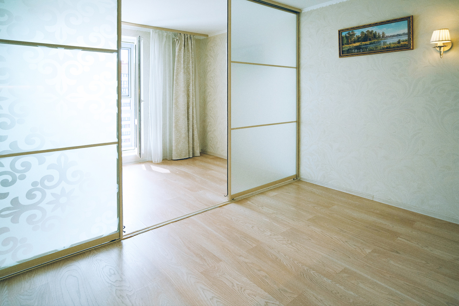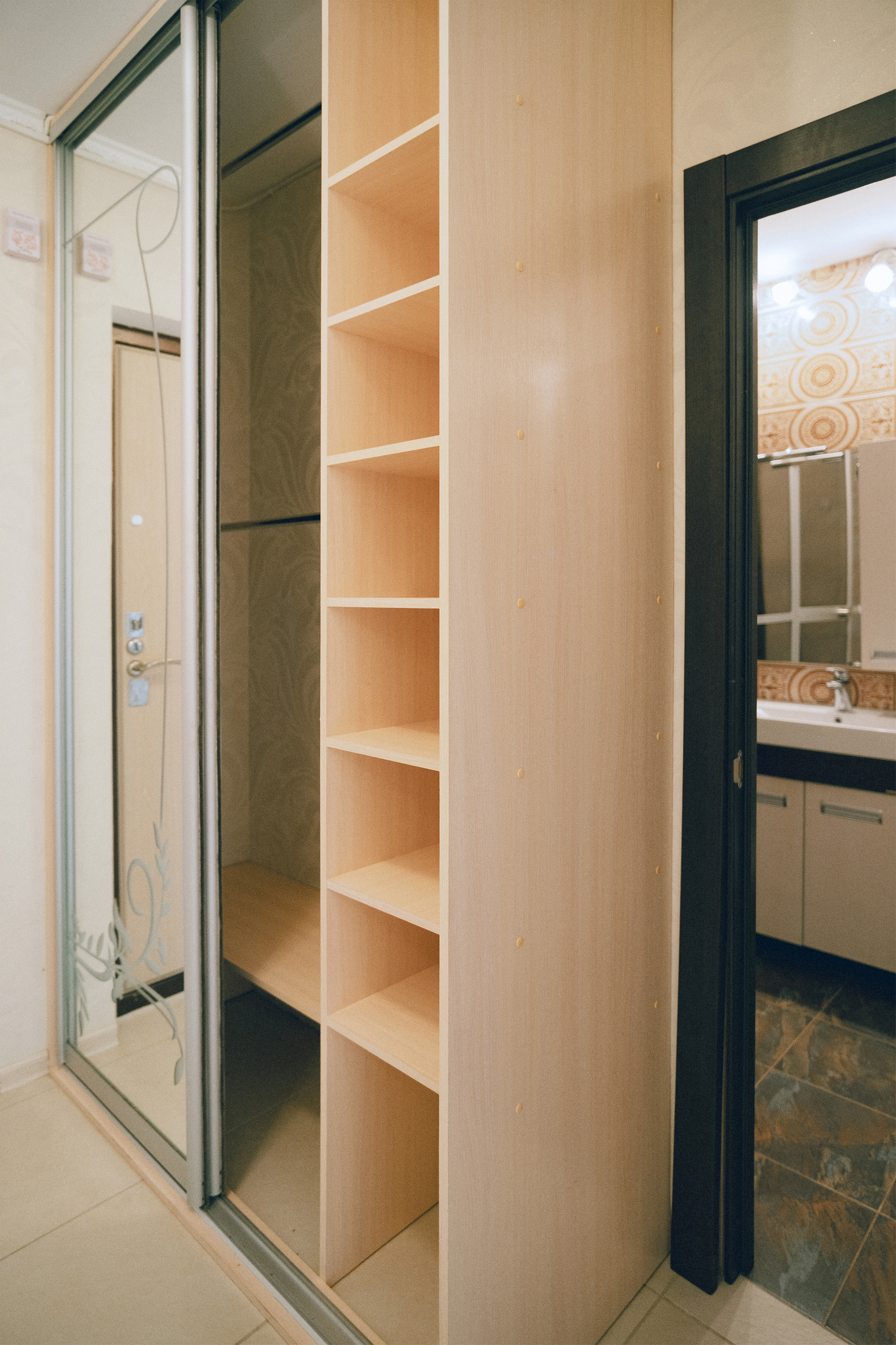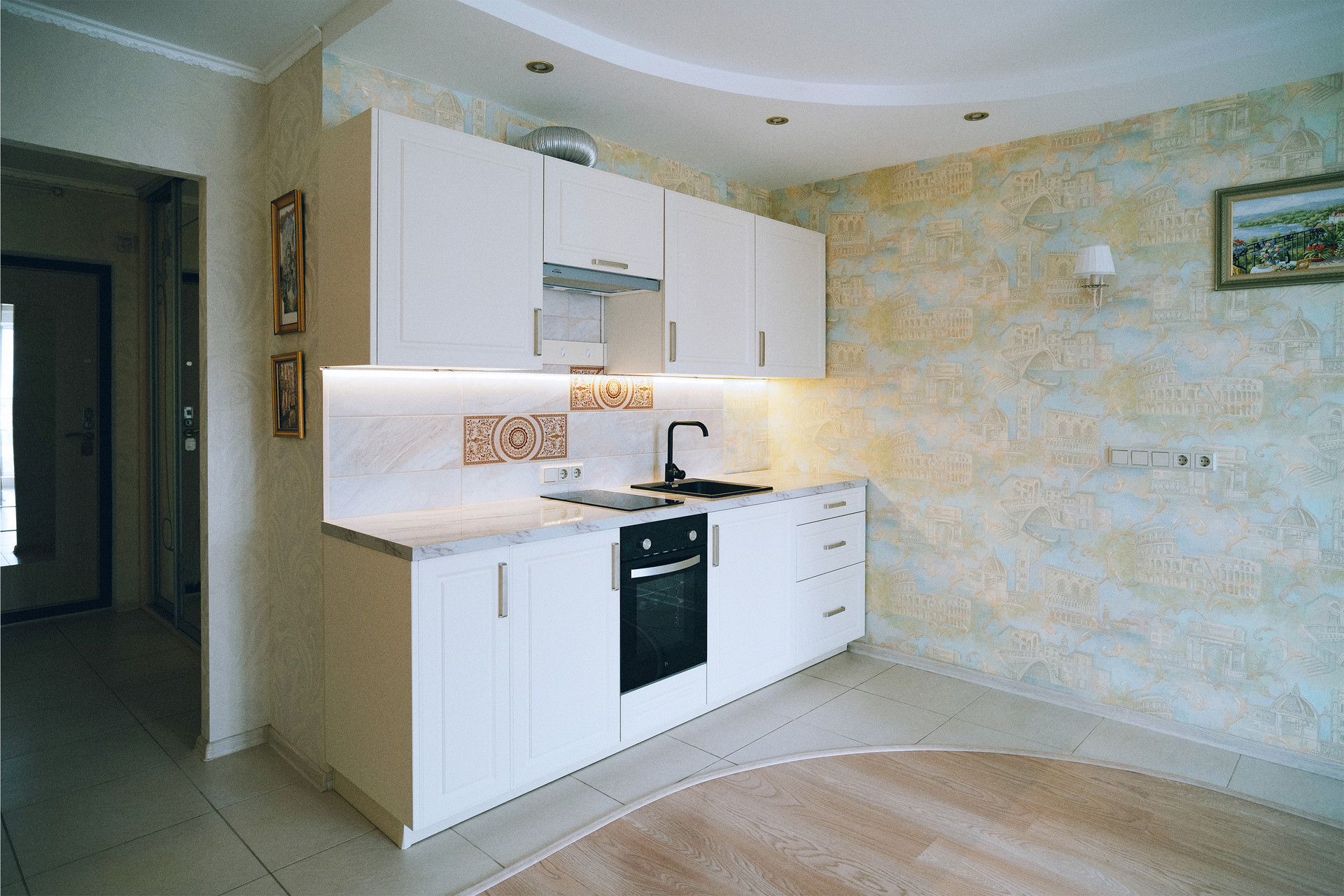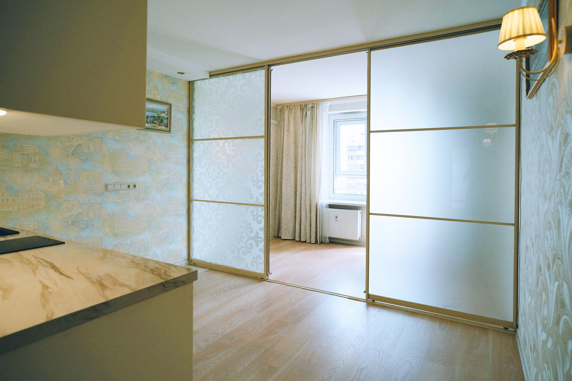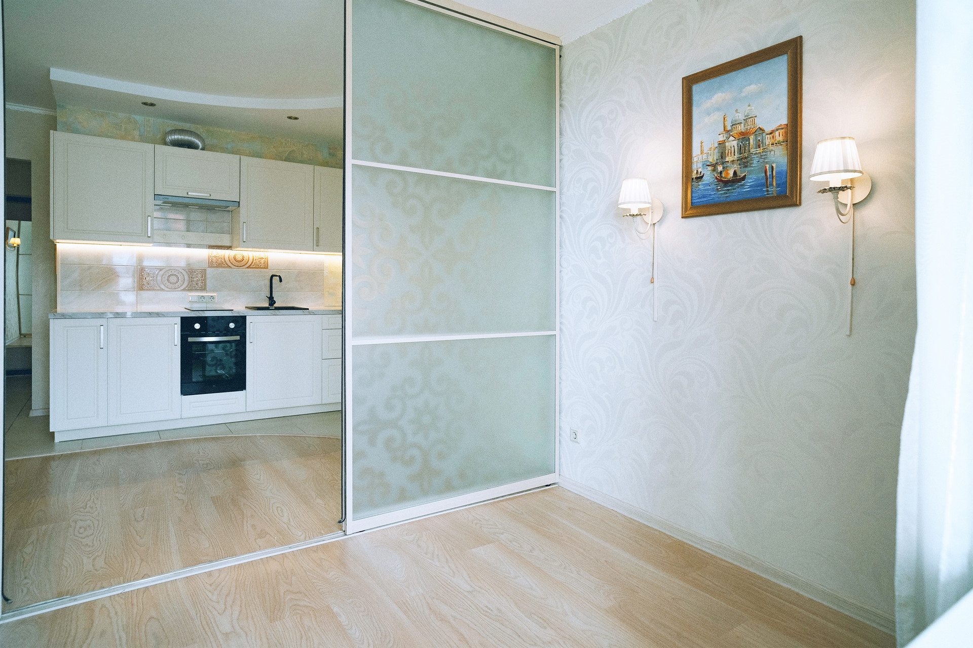 В квартире качественная отделка, установлена современная кухня, сделано зонирование комнаты на обеденную и зону отдыха. А в прихожей оборудован вместительный шкаф-купе.