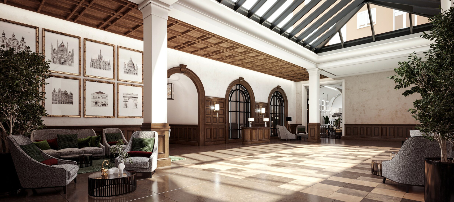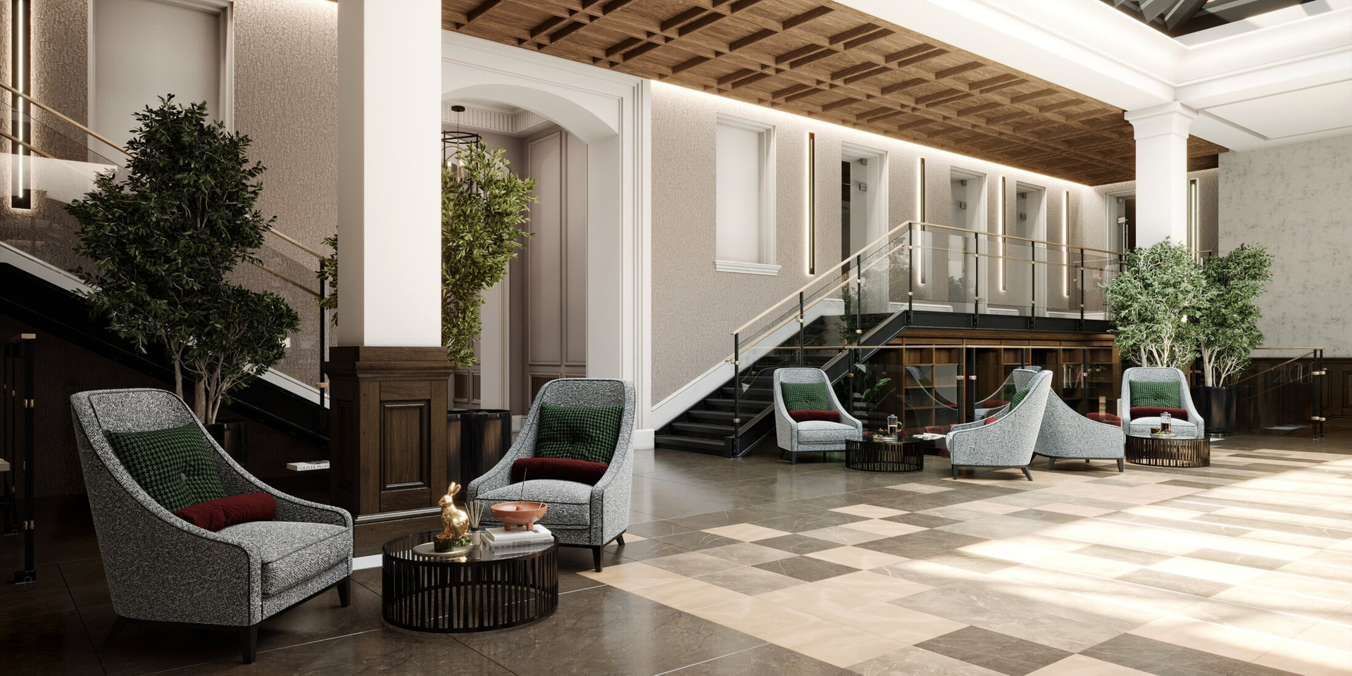 Зона лобби с beauty-кабинетами и зоной коворкинга