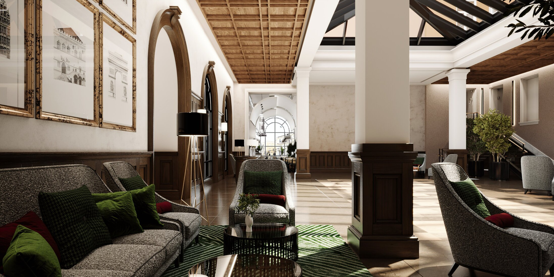 Зона лобби с beauty-кабинетами и зоной коворкинга
