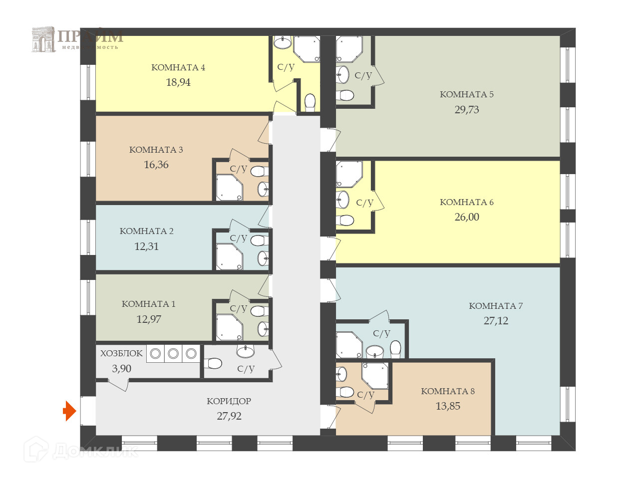 Восемь комнат переустроены в отдельные студии с персональным санузлом и мини-кухней: