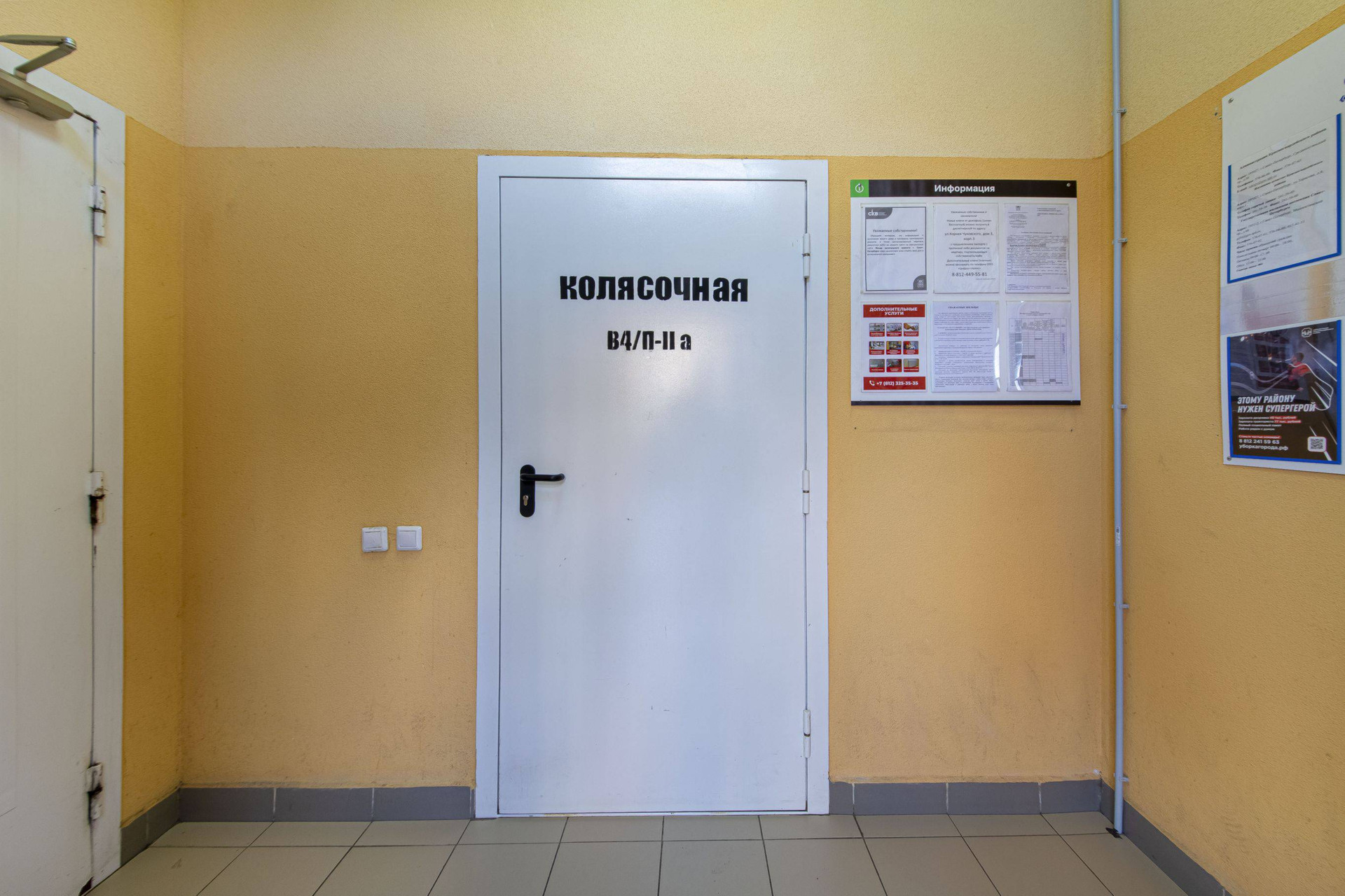 Закрытая лестничная площадка (безопасный коридор), можно оставлять велики и самокаты.