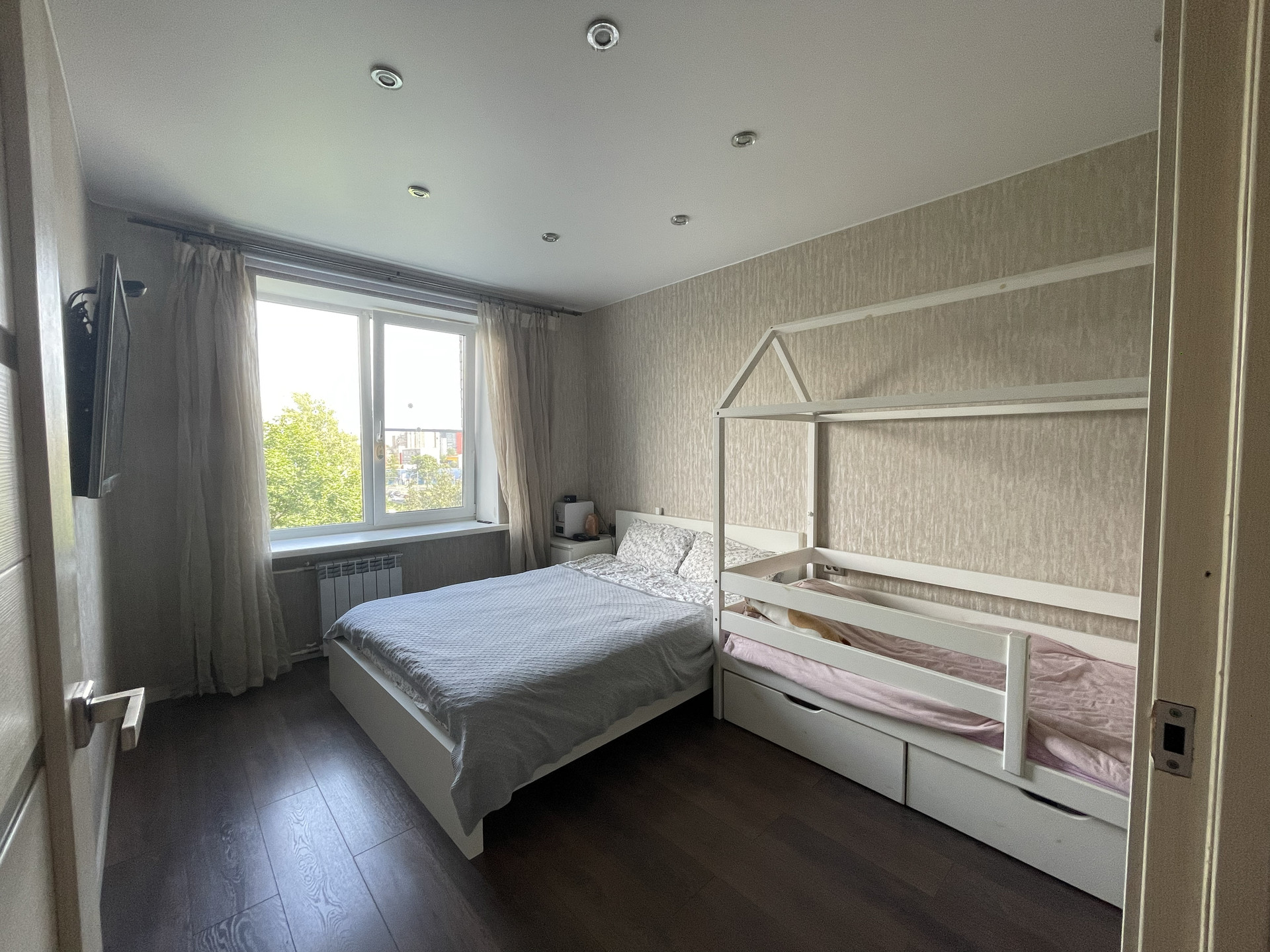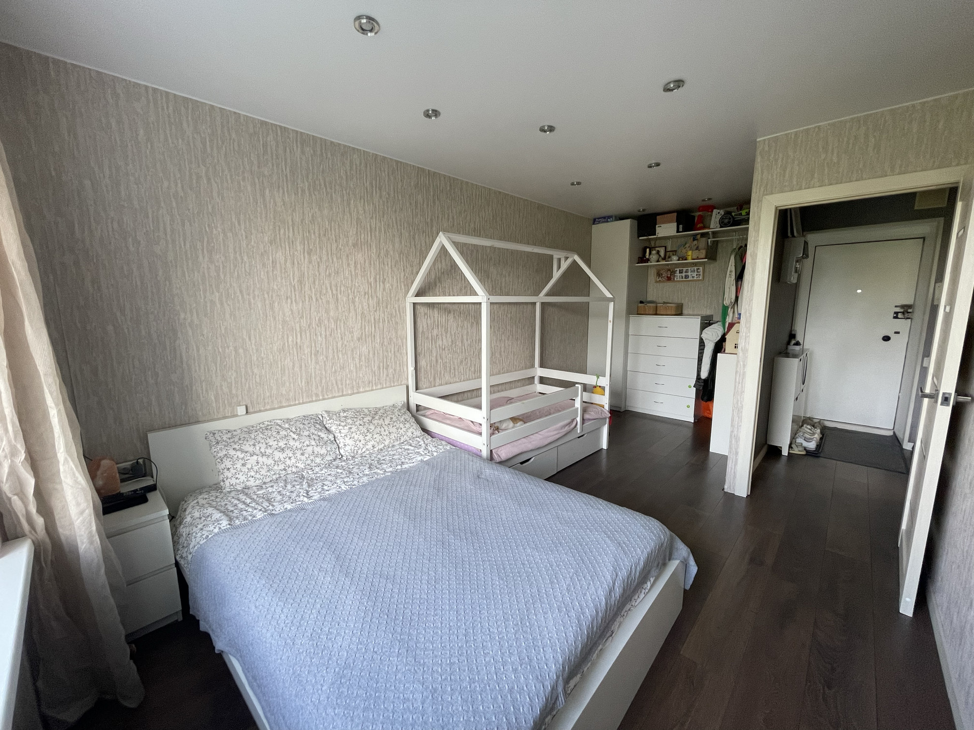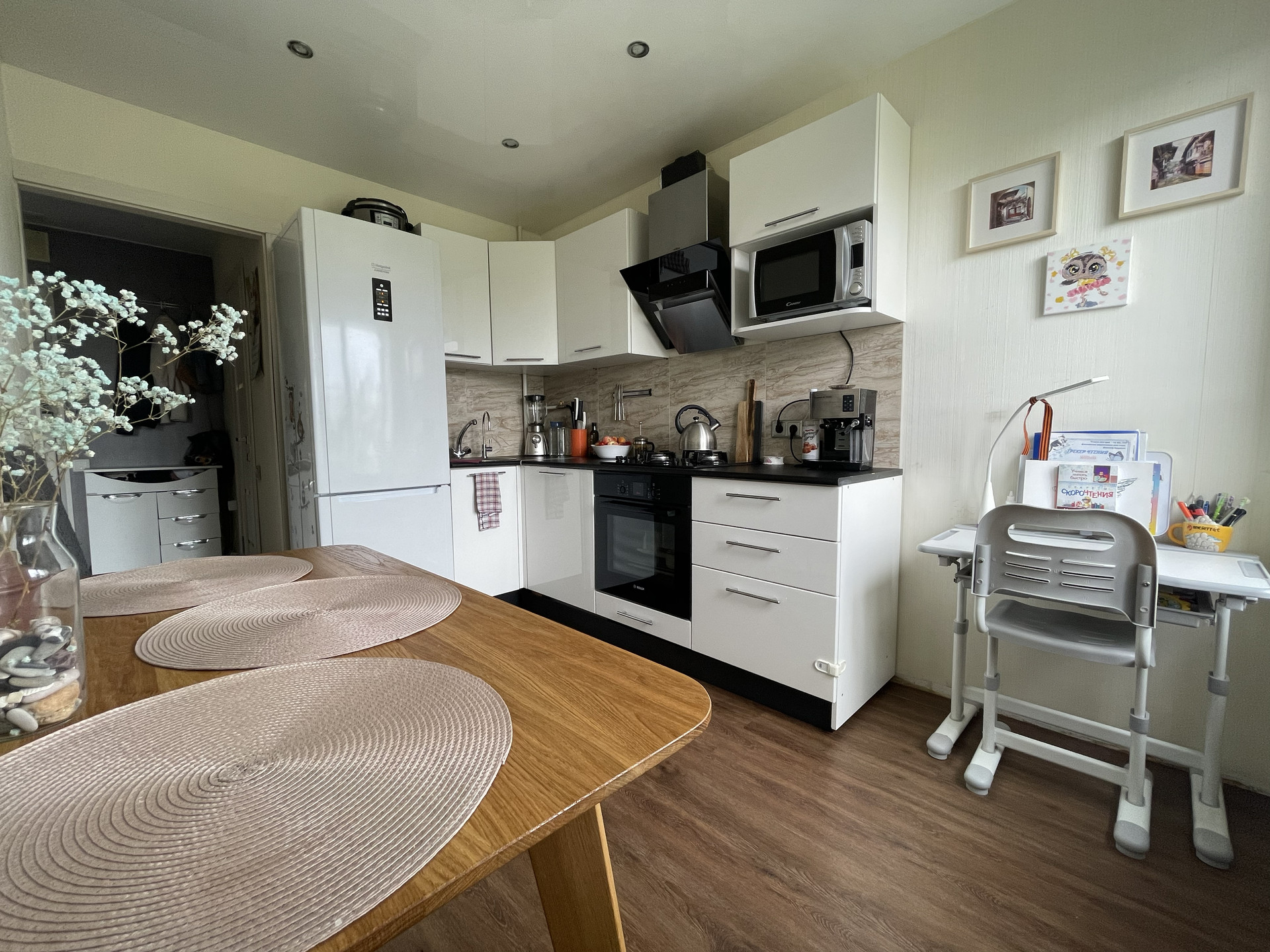 Остается встроенная кухня и техника (духовой шкаф BOSH, вытяжка, варочная панель, стиральная машина и холодильник), в комнате - гардеробная, по желанию 2хспальная кровать.