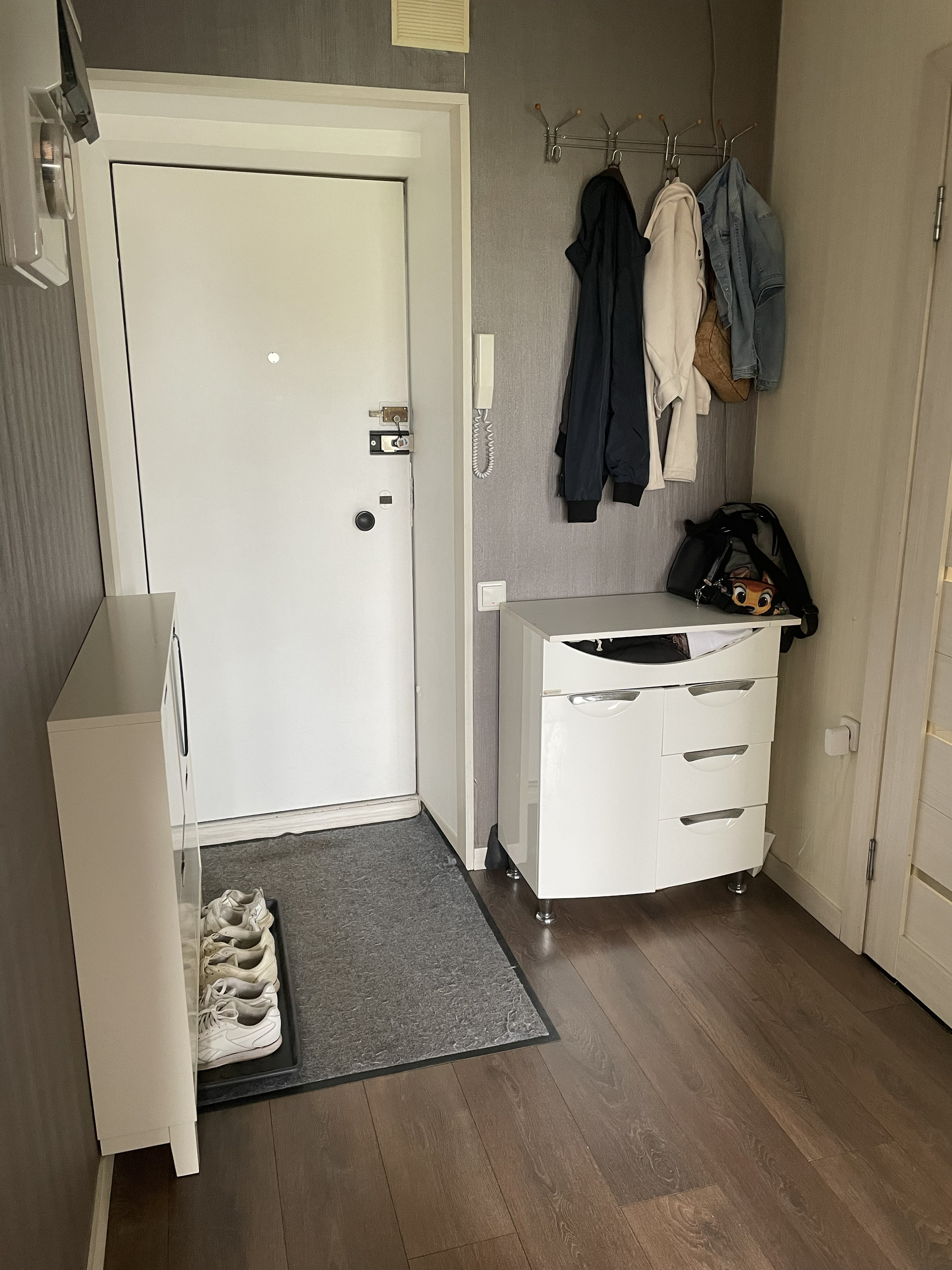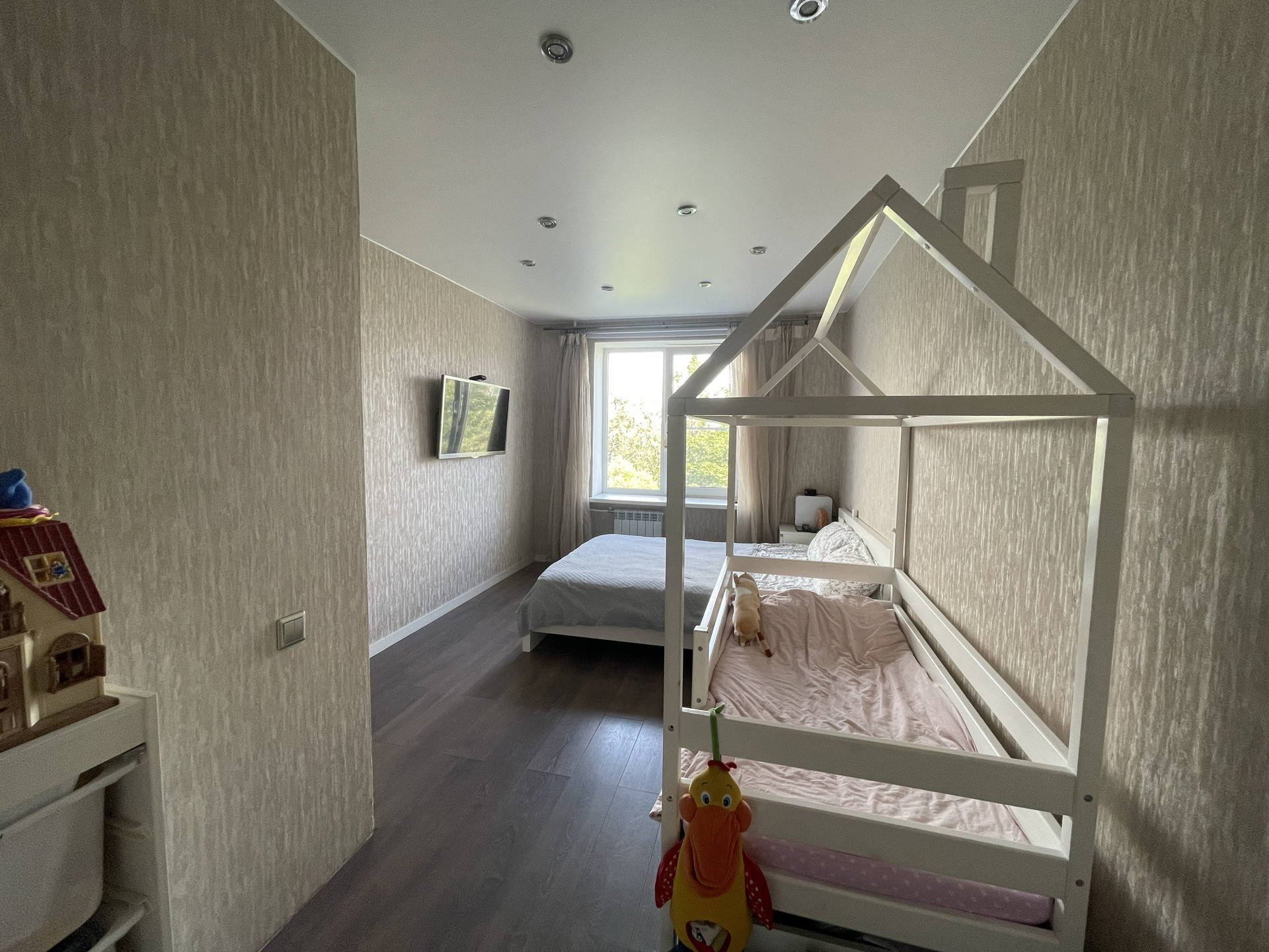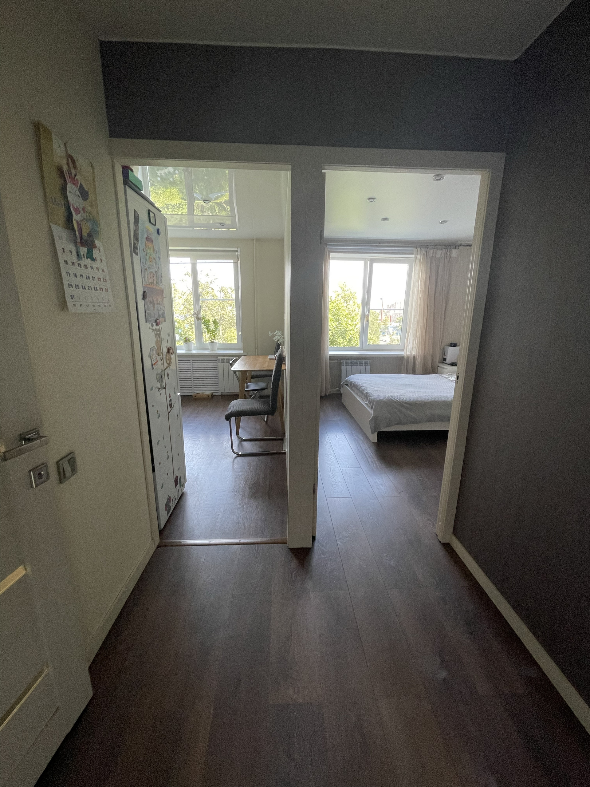 Остается встроенная кухня и техника (духовой шкаф BOSH, вытяжка, варочная панель, стиральная машина и холодильник), в комнате - гардеробная, по желанию 2хспальная кровать.