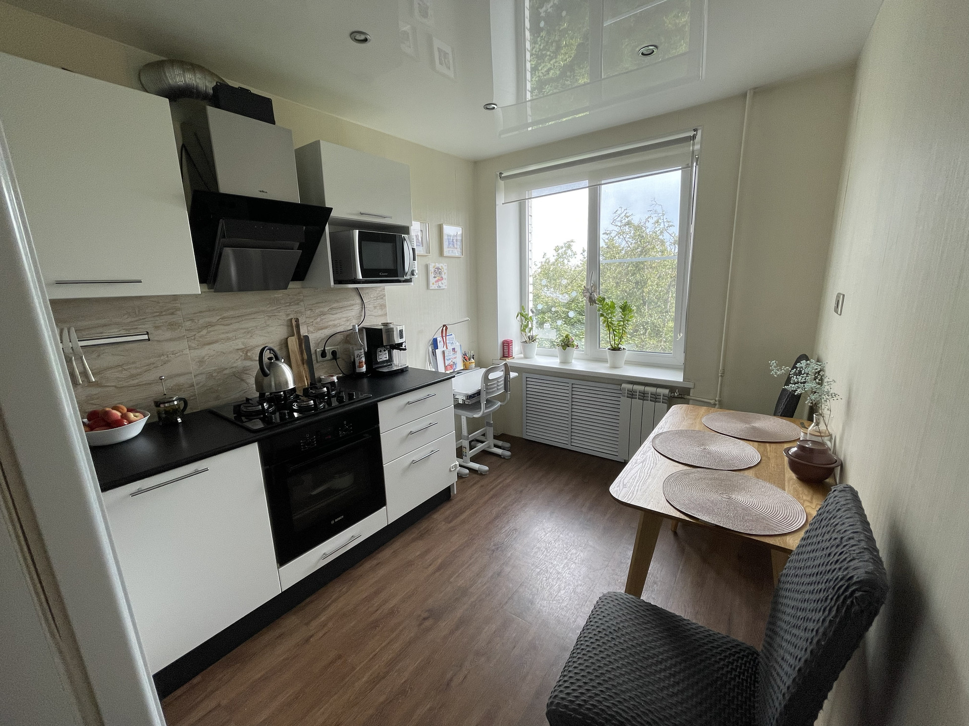 Сделан хороший ремонт: полностью меняли трубы, электрику, батареи, 5камерные стеклопакеты, натяжные потолки, полы (кварц-винил /ламинат), ванная - плитка. Ровняли стены, стяжки на полу в комнате, в ванной новая сантехника, cмесители Groche.