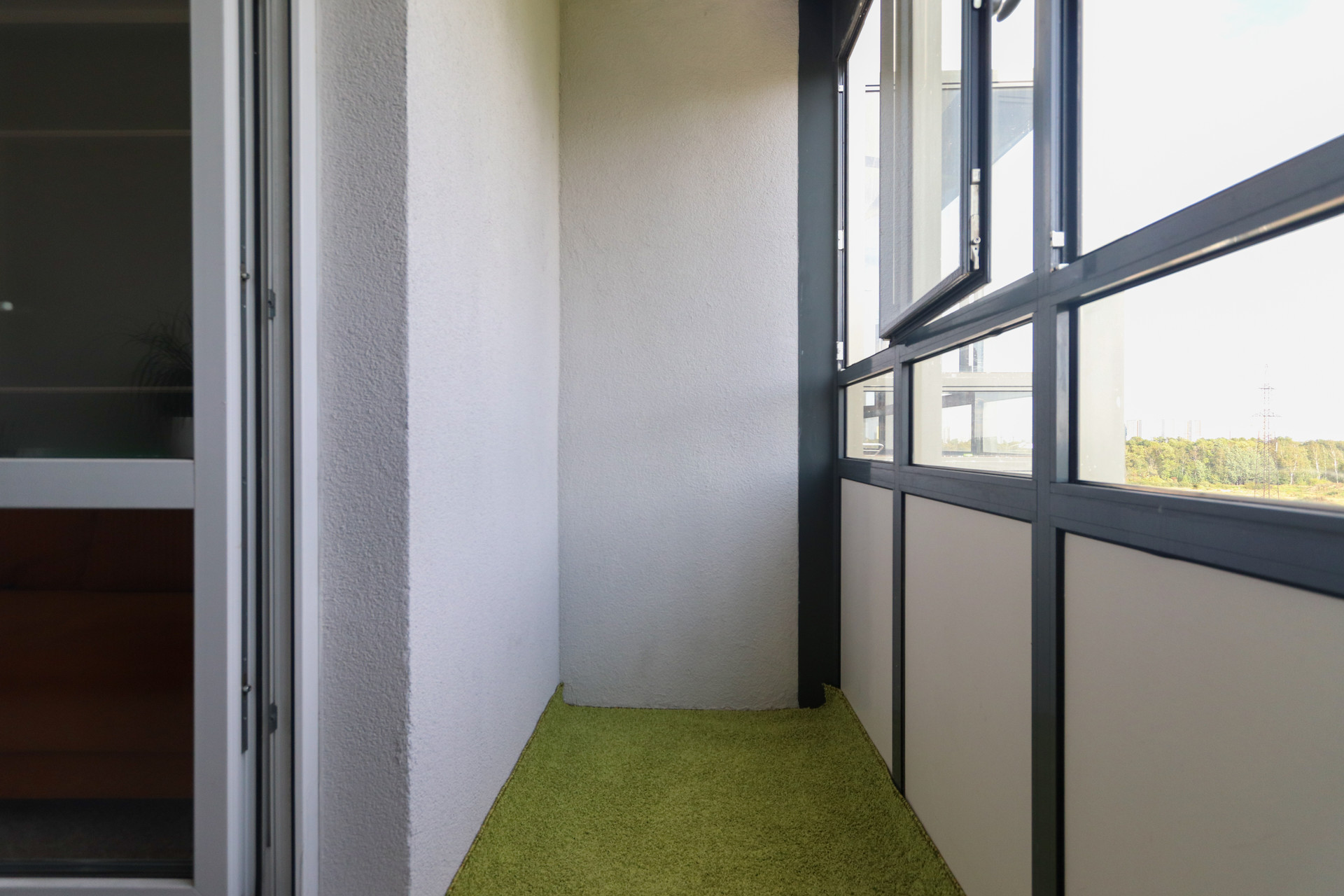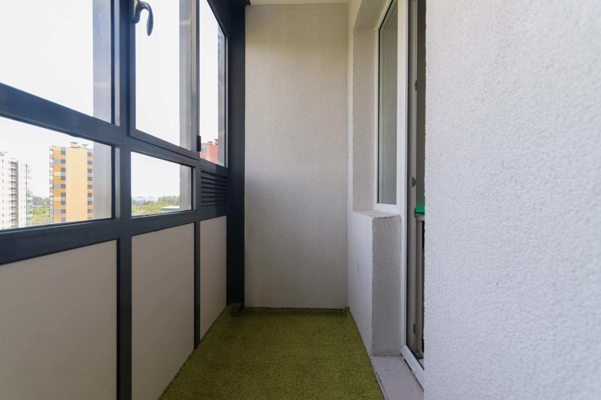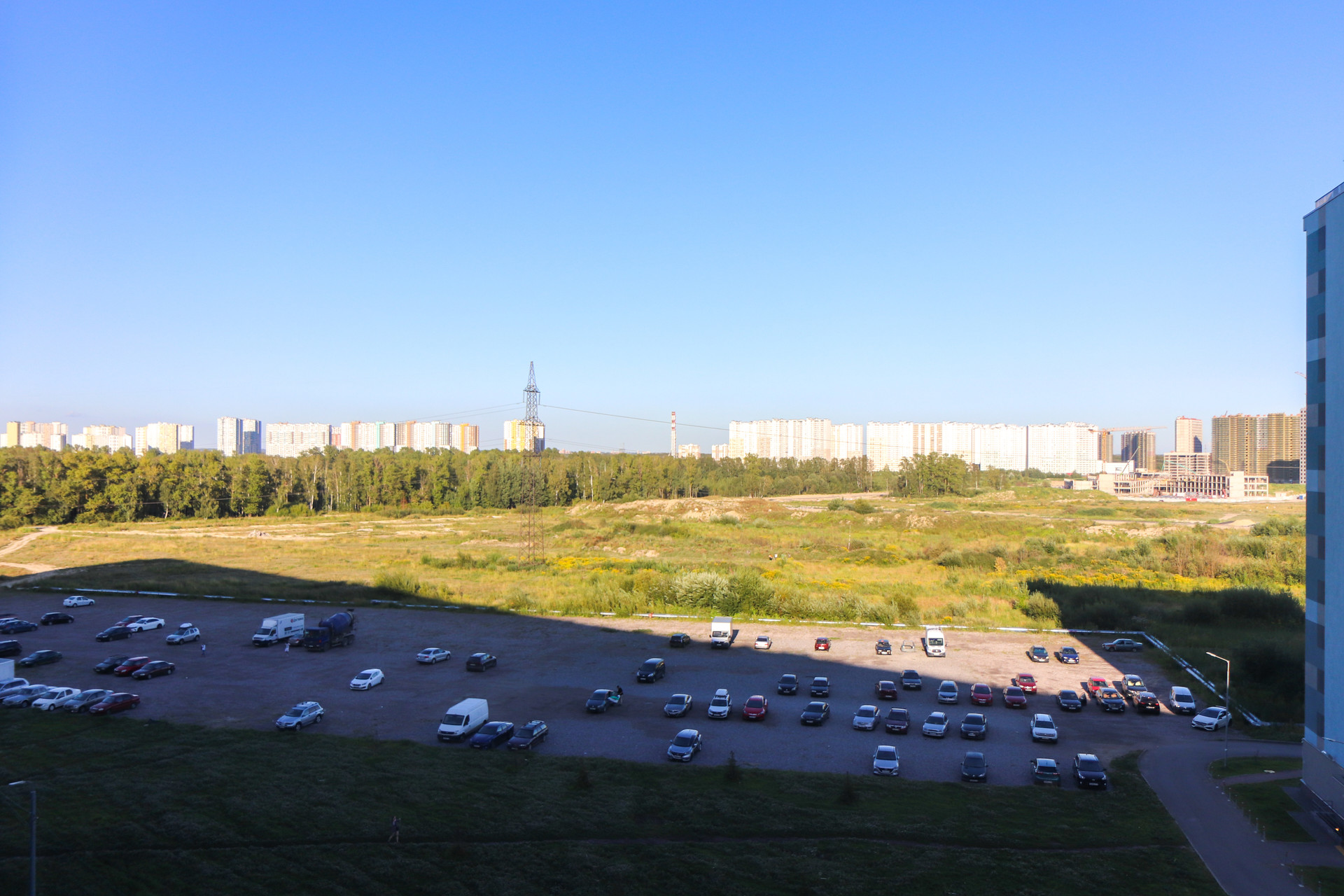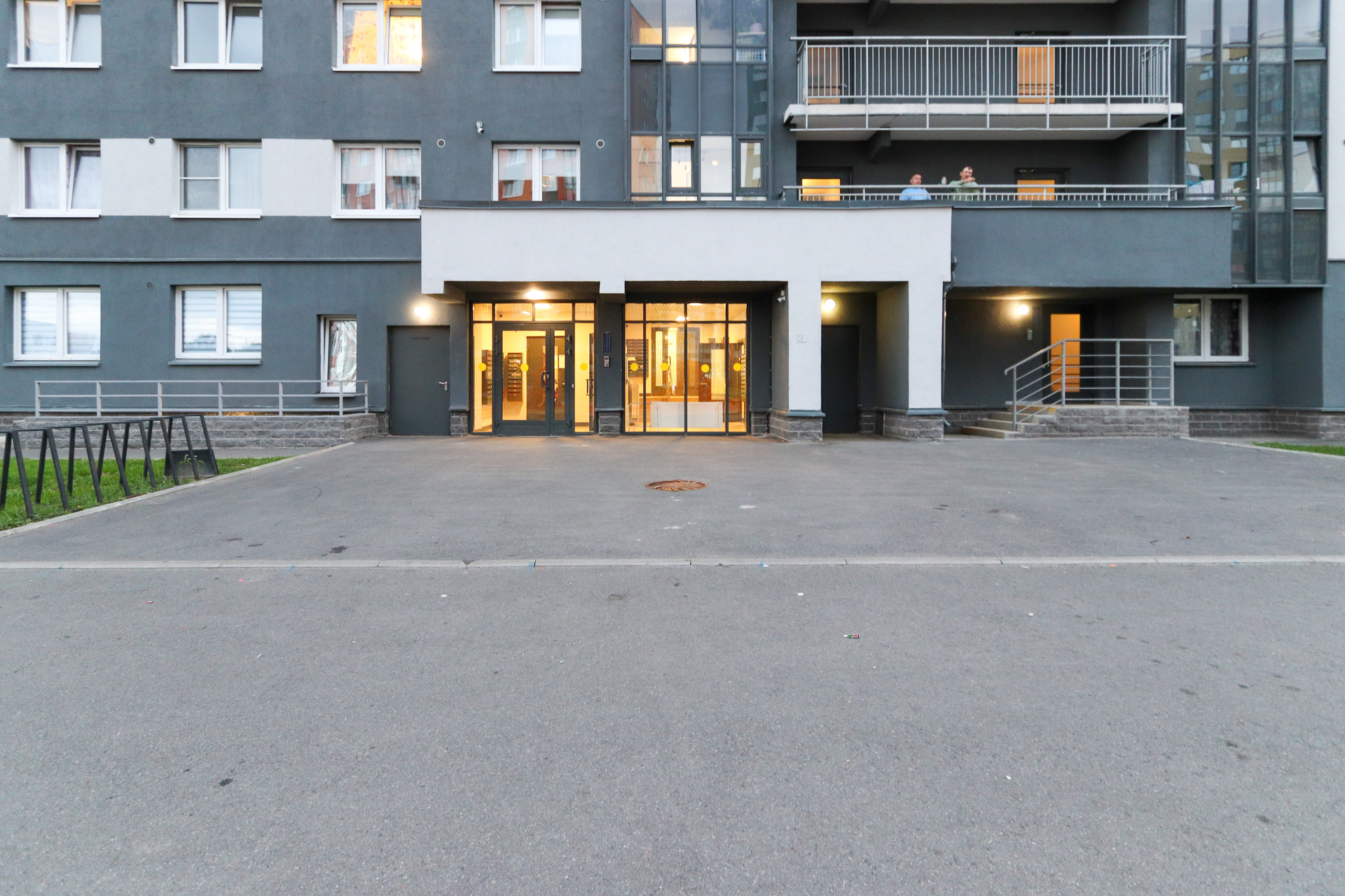 У подъезда большая детская и спортивная плащадки, зона для отдыха. Но окна выходят в другую сторону, что является большим плюсом по сравнению с другими квартирами в этом ЖК. Те, у кого окна на детскую и волейбольную площадку, вероятно, не очень рады шуму до поздней ночи. Из окна виден двор покрытый клевером, лес, рядом нет шумных автодорог, большая парковочная зона.