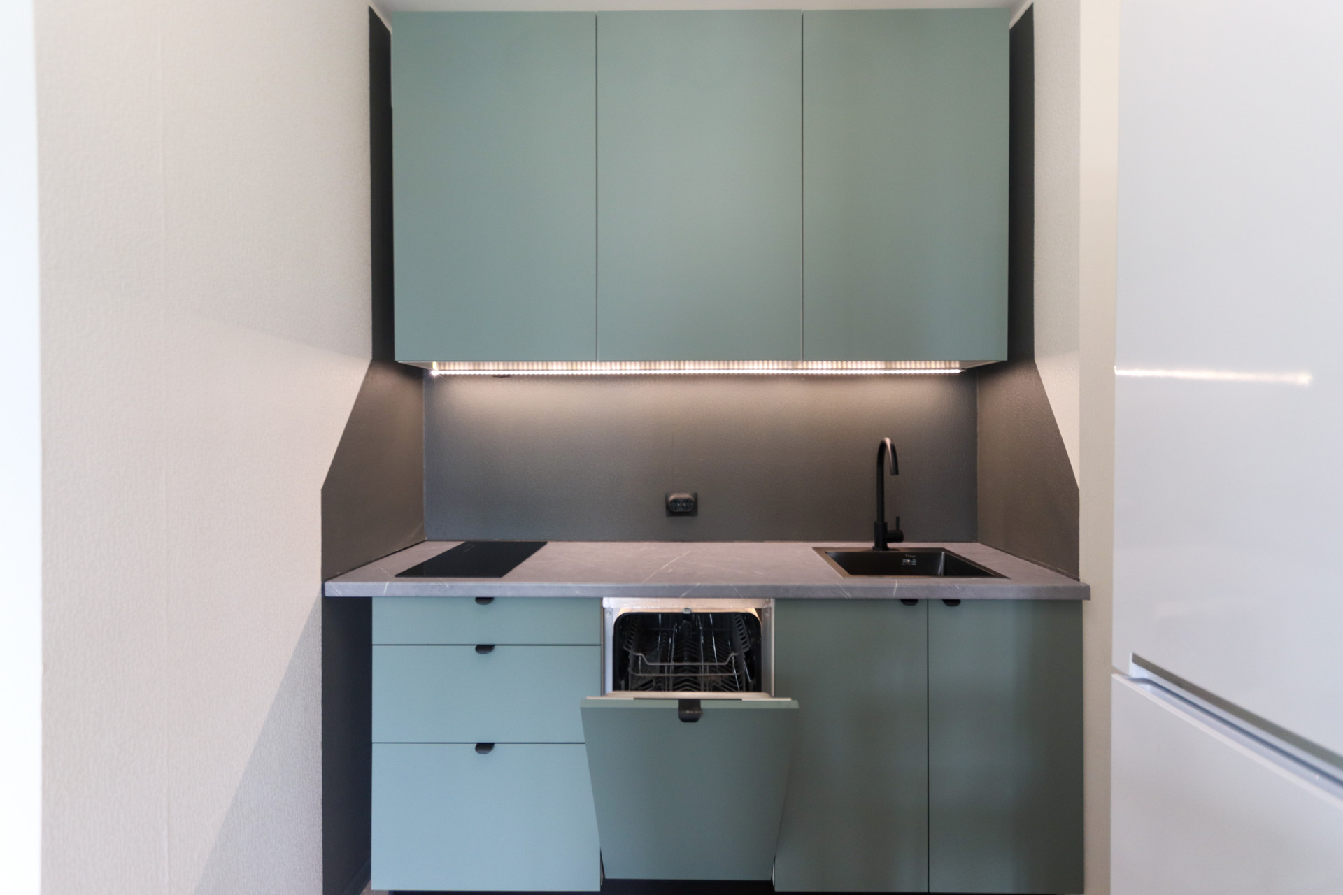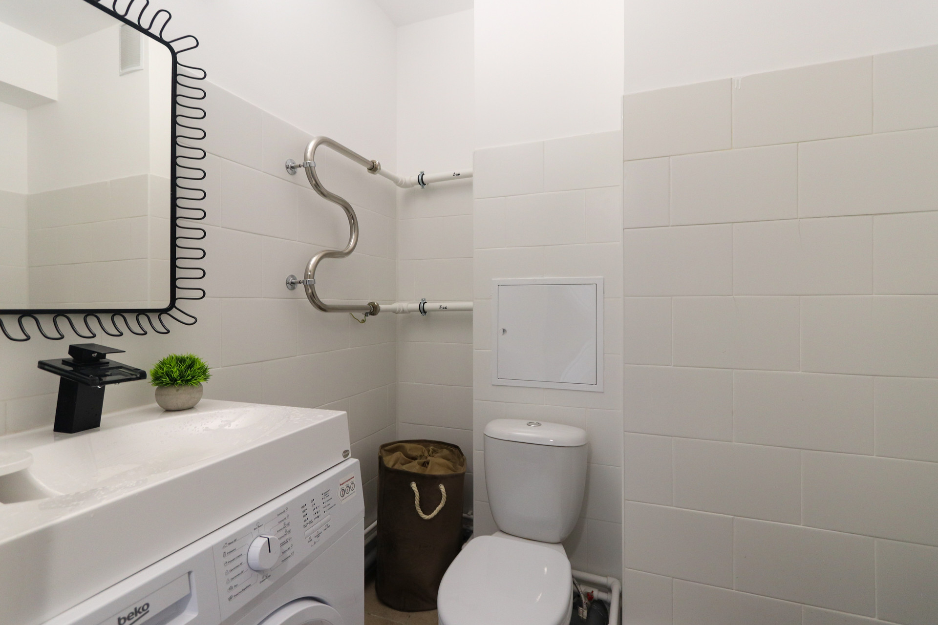 Новая бытовая техника: стиральная машина, посудомоечная машина, холодильник, варочная поверхность. Вместо гибких подводок использованы металлопластиковые трубы (кто сталкивался с заливами по причине разрыва гибкой проводки оценят), дополнительные фильтры для сохранности посудомоечной и стиральной машинок.