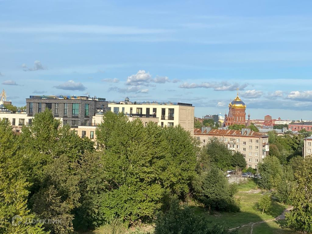 Панорамный вид на город,  на реку, на парк Екатерингоф, Богоявленскую церковь.