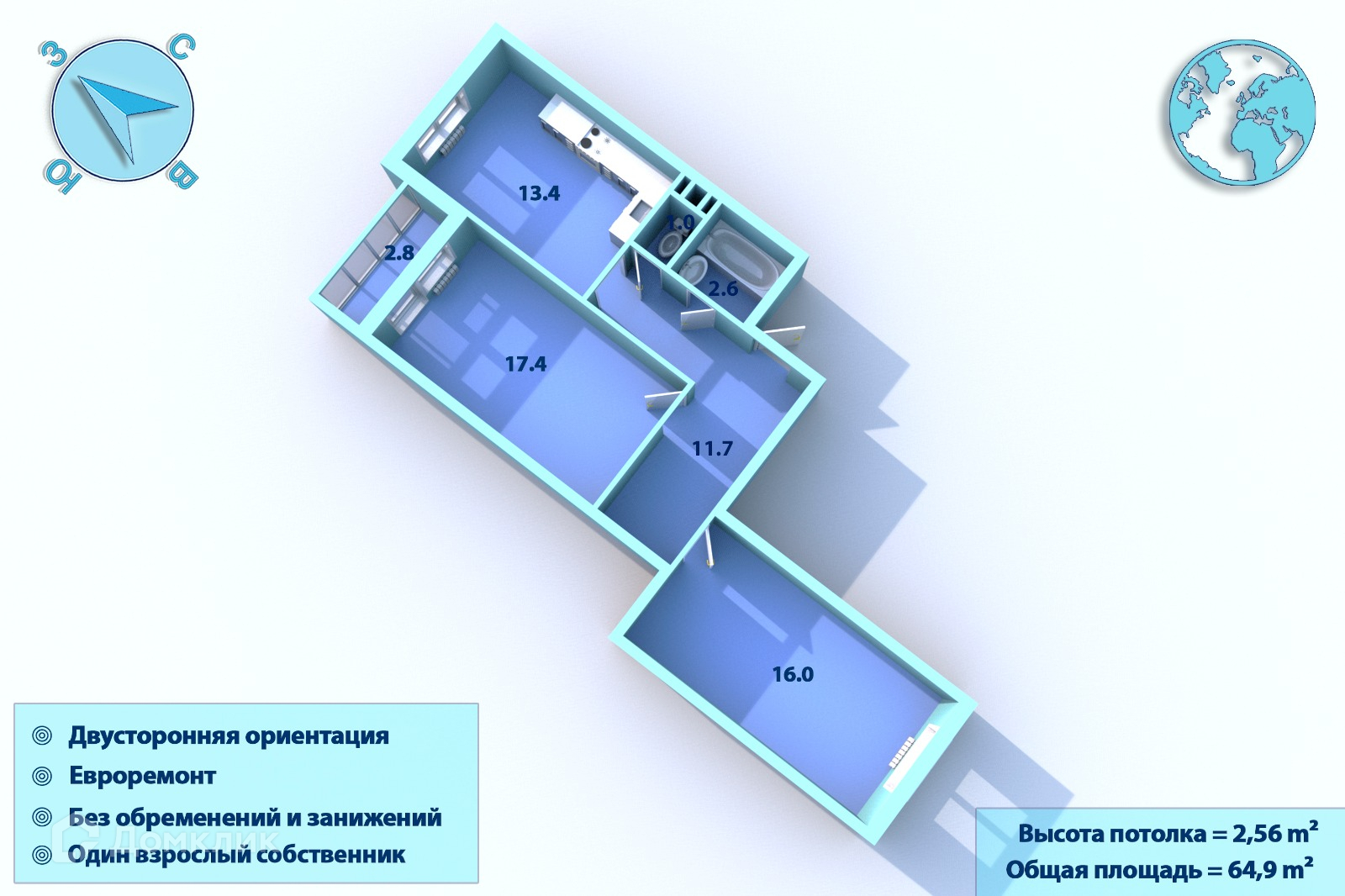 Общая площадь 64.9 м2