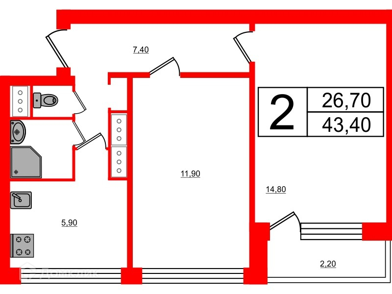 Общая площадь 43.4 м2