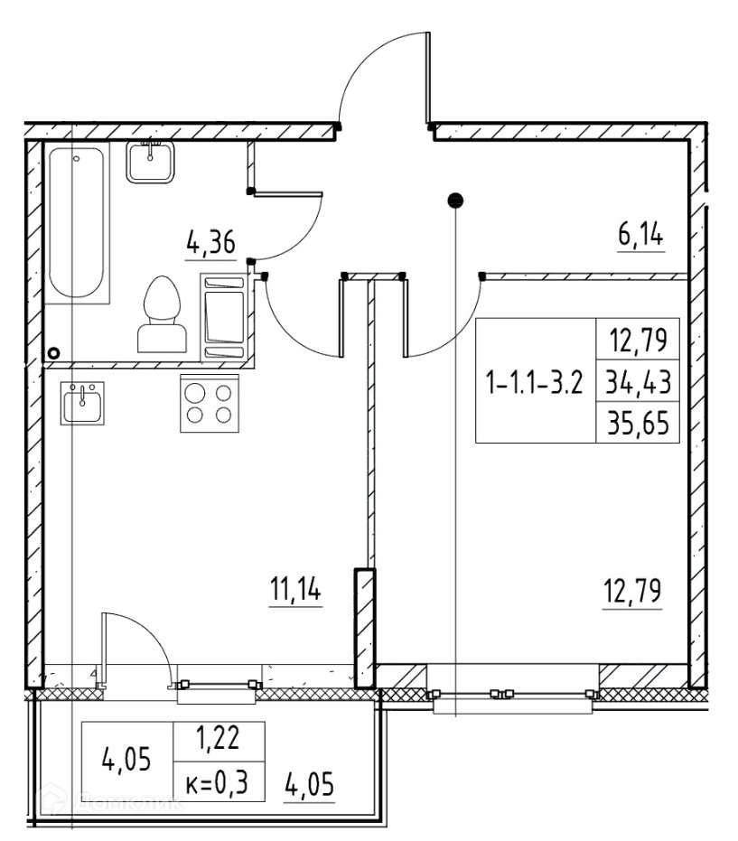 Общая площадь 34.43 м2