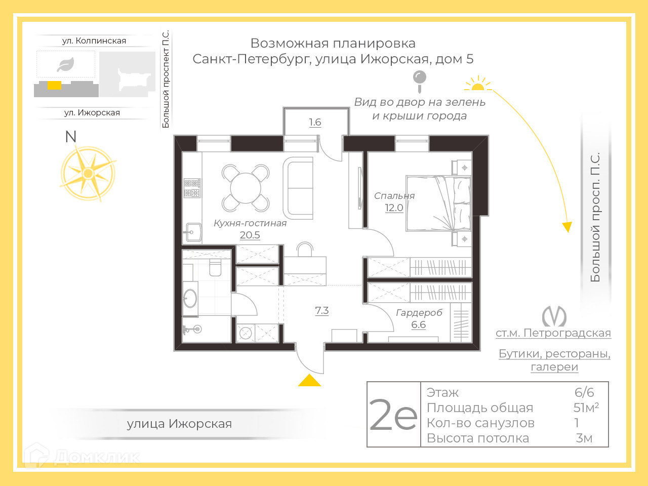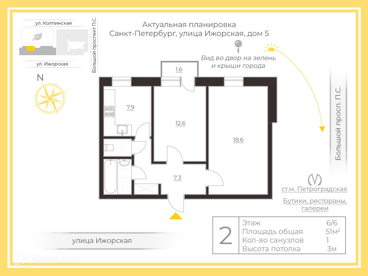2-комнатная квартира, 51 м2, этаж 6 / 6, на продажу в Санкт-Петербурге, Ижорская улица, 5