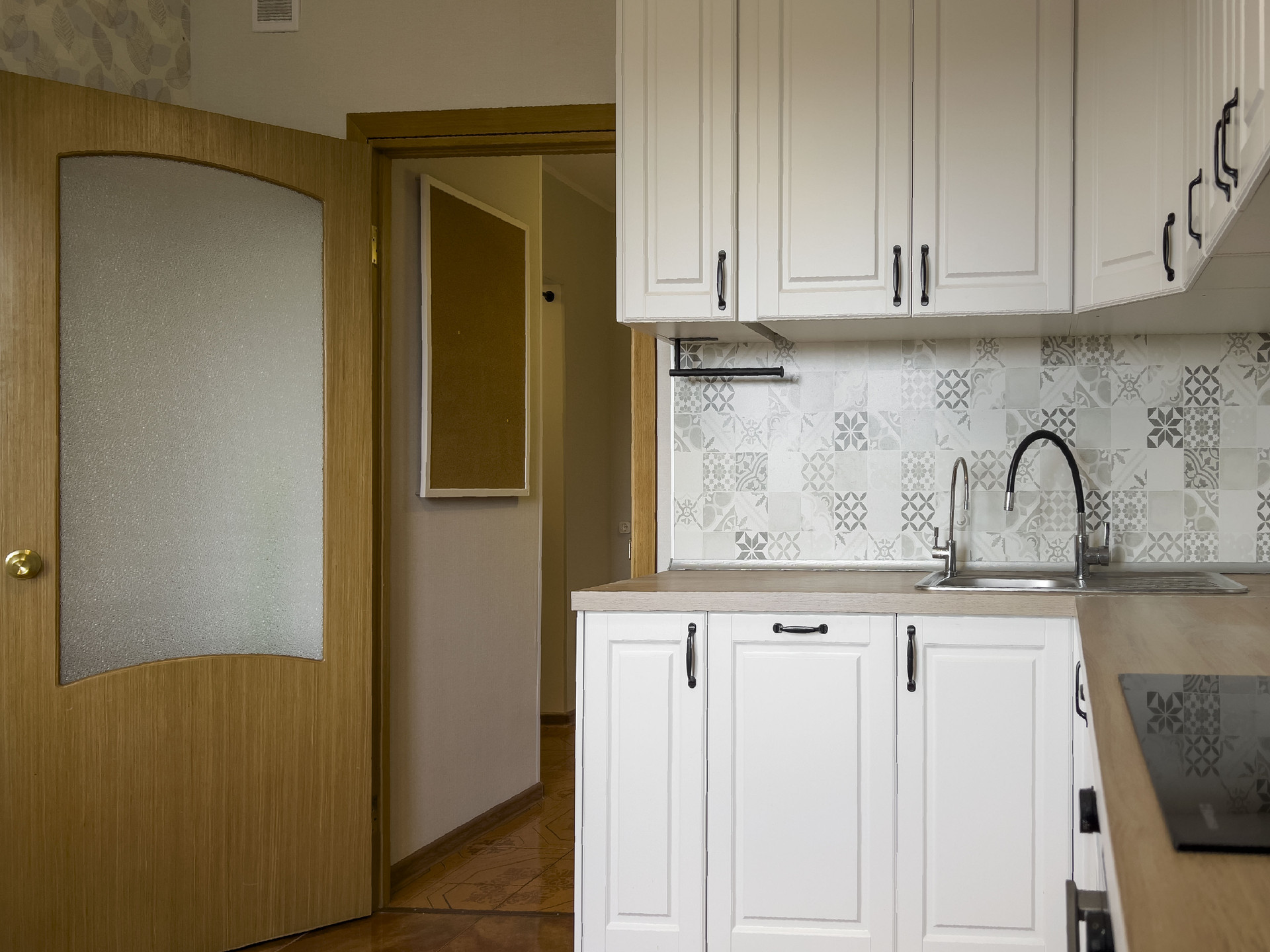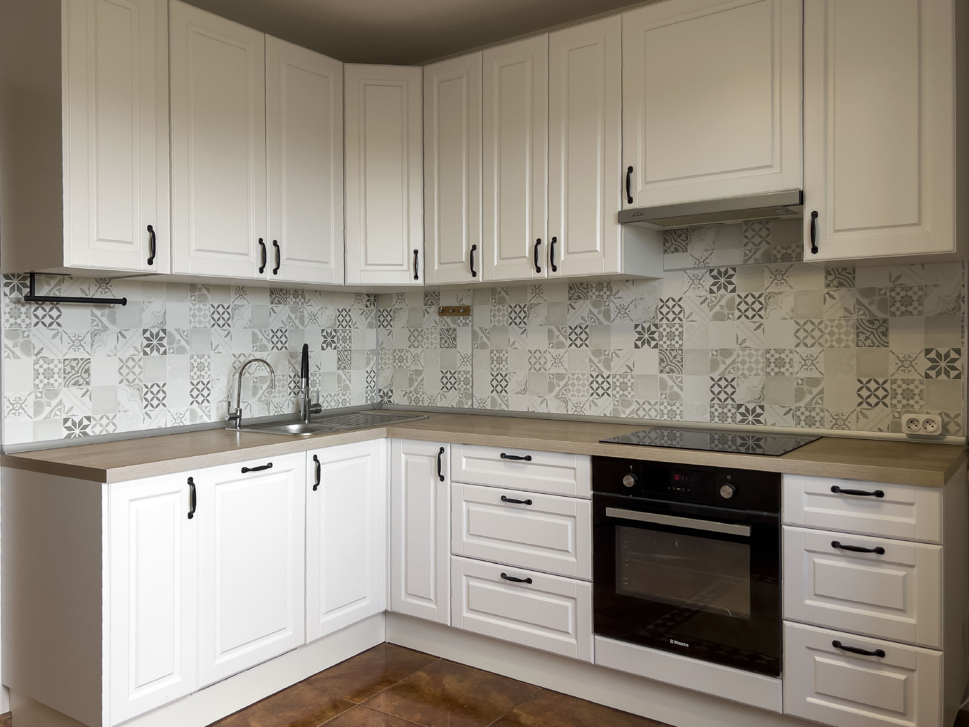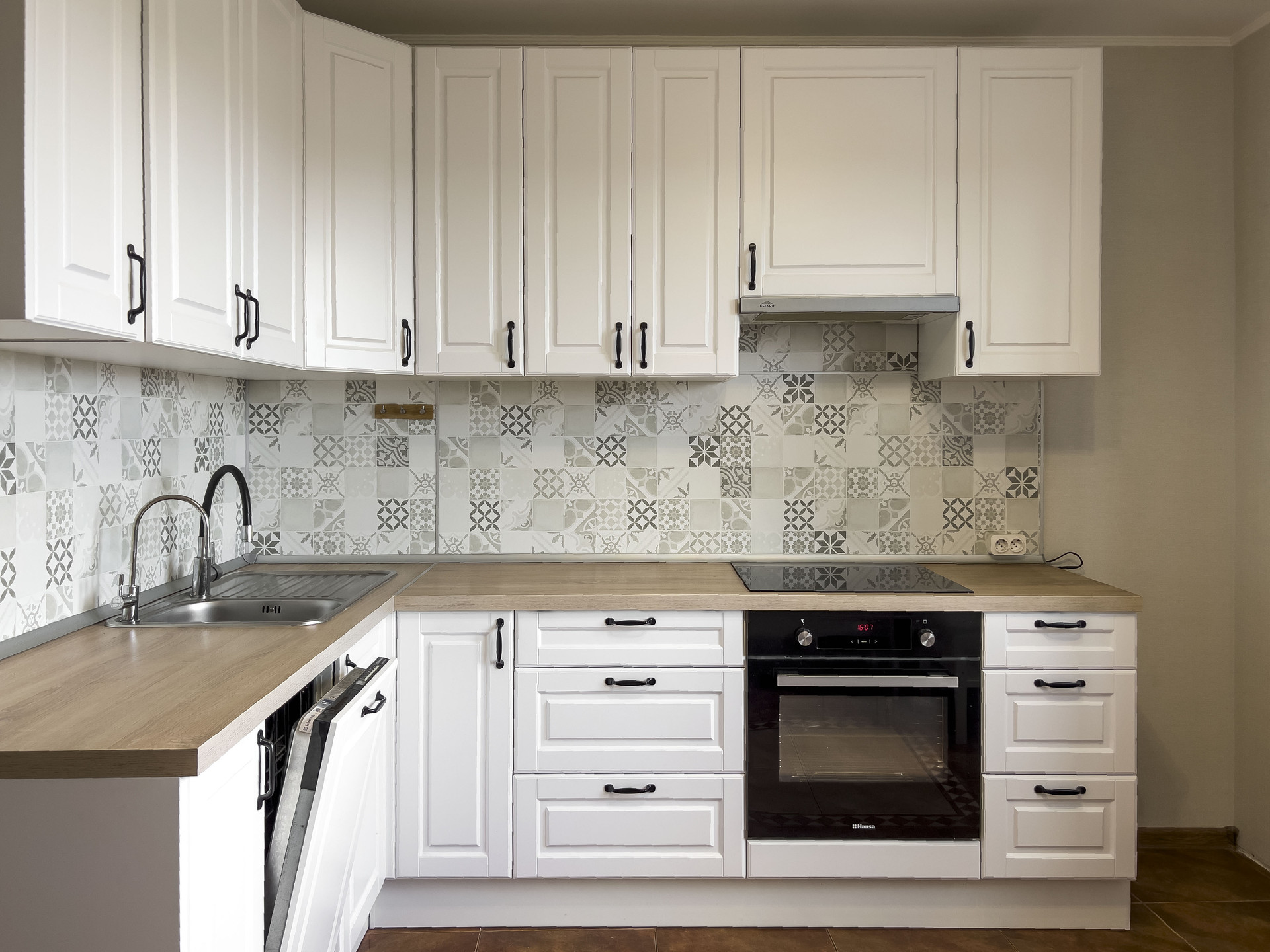 Покупателю остается кухня со встроенной техникой: варочная поверхность Hansa, духовой шкаф Hansa, вытяжка Elikor, посудомоечная машина Electrolux.