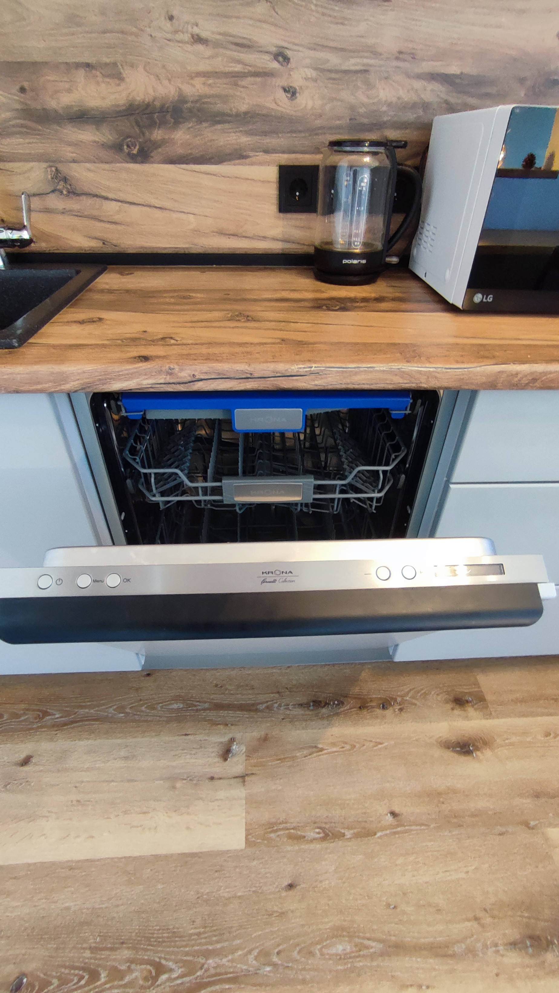 На кухне: встроенный кухонный гарнитур, с большим количеством шкафов для хранения, отдельный стояк водопровода, в раковине встроен измельчитель, фильтр с питьевой водой, посудомоечная машина Krona на 12 персон, вытяжка с фильтром, духовка не стандартных размеров (450 мм), варочная панель с 3 конфорками, встроенный холодильник и морозильная камера. С кухни выход на балкон.