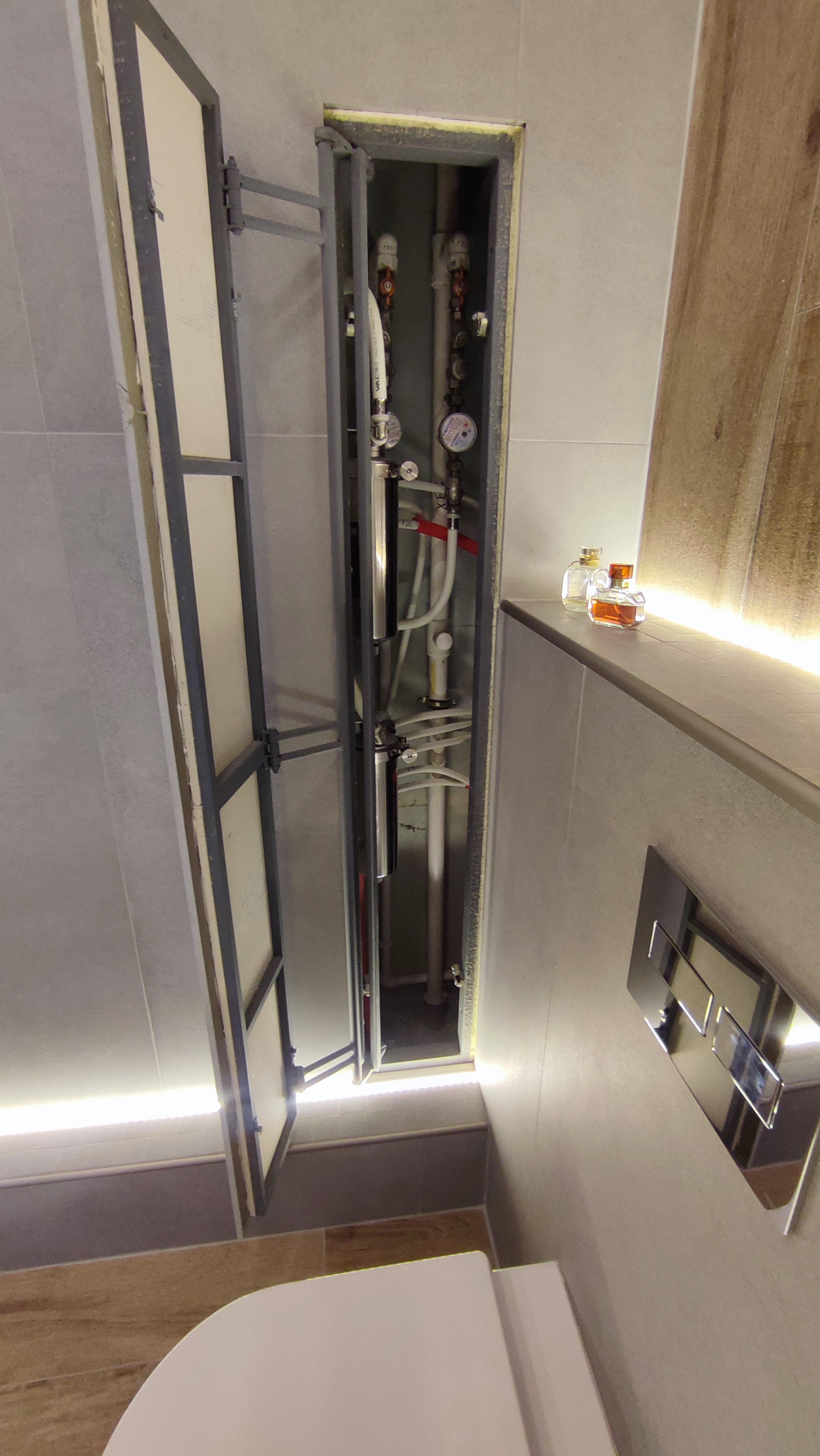 В санузле: складная дверь, инсталляция, душевая кабина под заказ, установлены фильтры на воду, отдельный стояк водопровода, теплый пол, стиральная машинка Lg, смесители Zeegrez, гигиенический душ AmPm, верхний и нижний свет, на стенах и на полу плитка Kerama Marazzi.