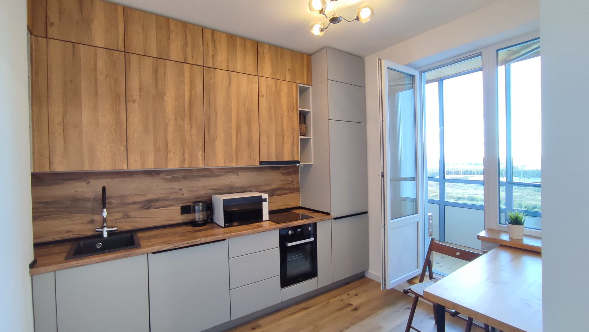 Все подоконники в квартире из натурального дерева. Отделка пола и потолка балкона также произведена натуральным деревом.