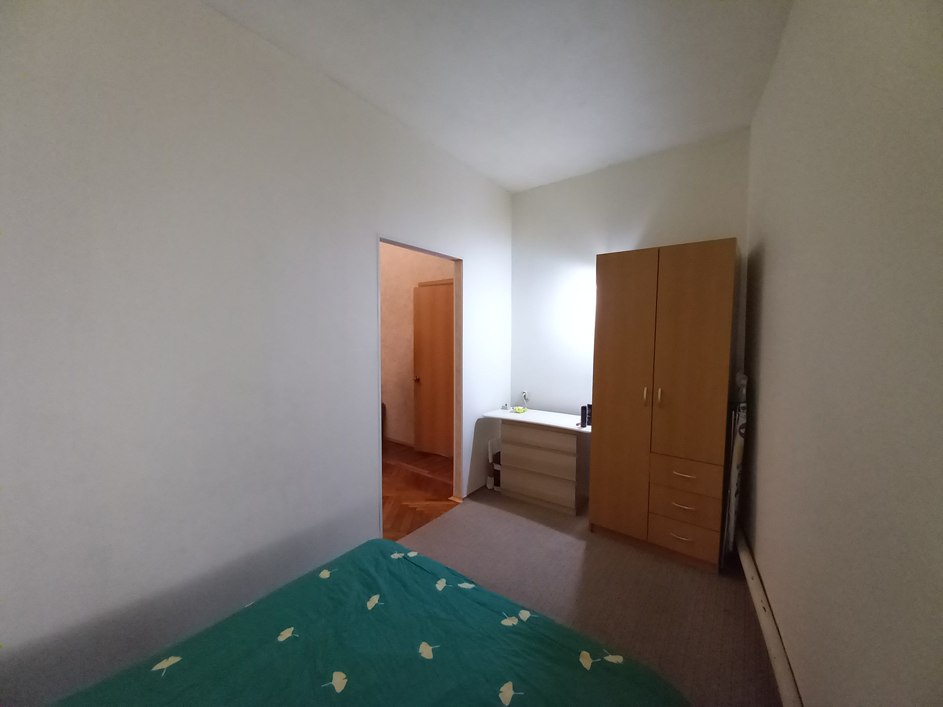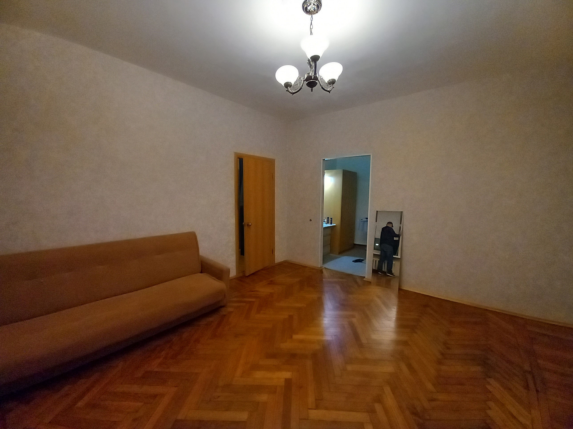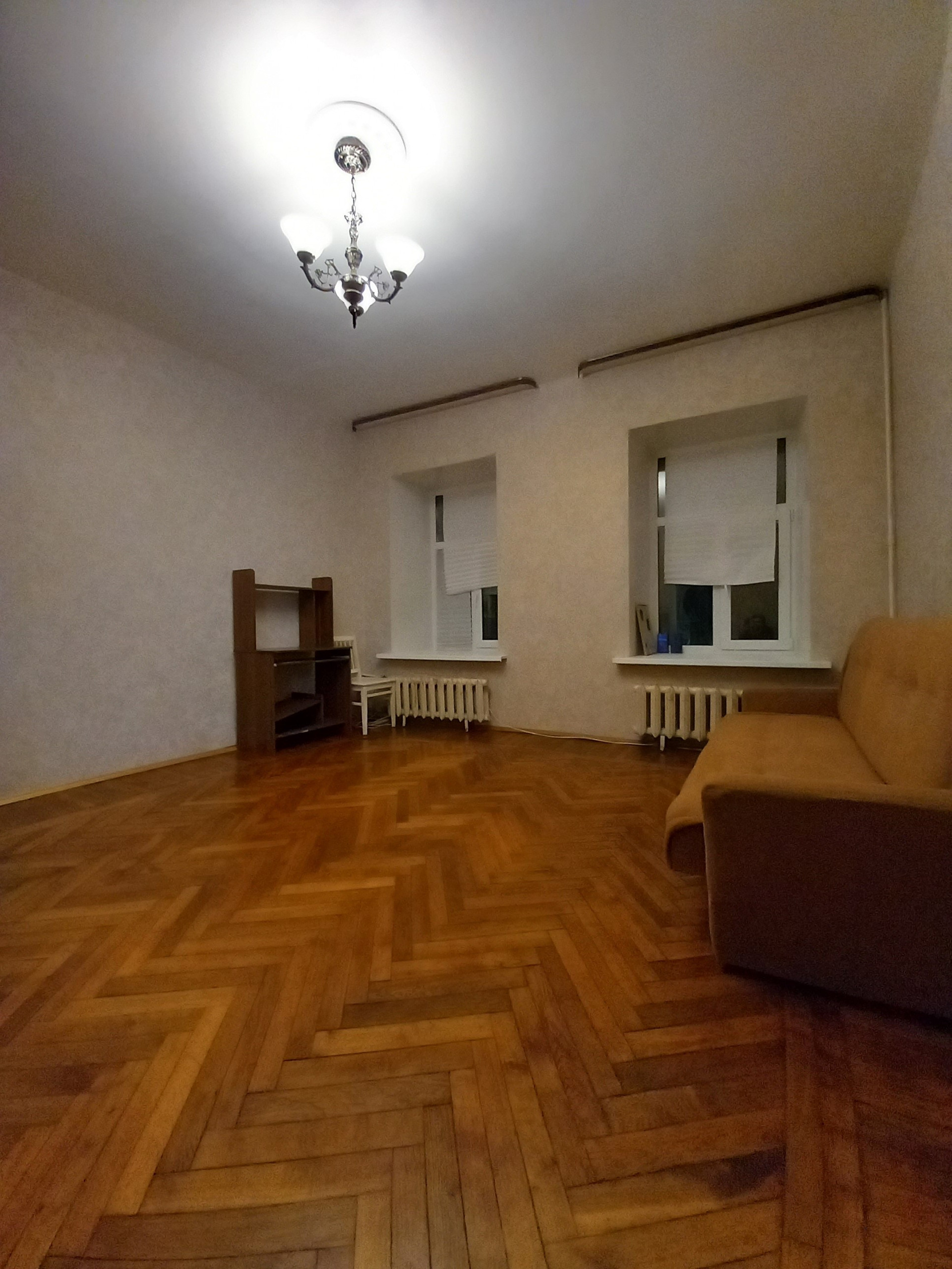 Квартира дворовая, высокий первый этаж ( в окна с улицы не заглянуть), одна квартира на этаже. Комната большая, искусственно поделена на две зоны: гостинная и спальня. Теплая, батареи большие, стены толстые, на окнах стеклопакеты. Ремонт косметический. Встречная покупка.