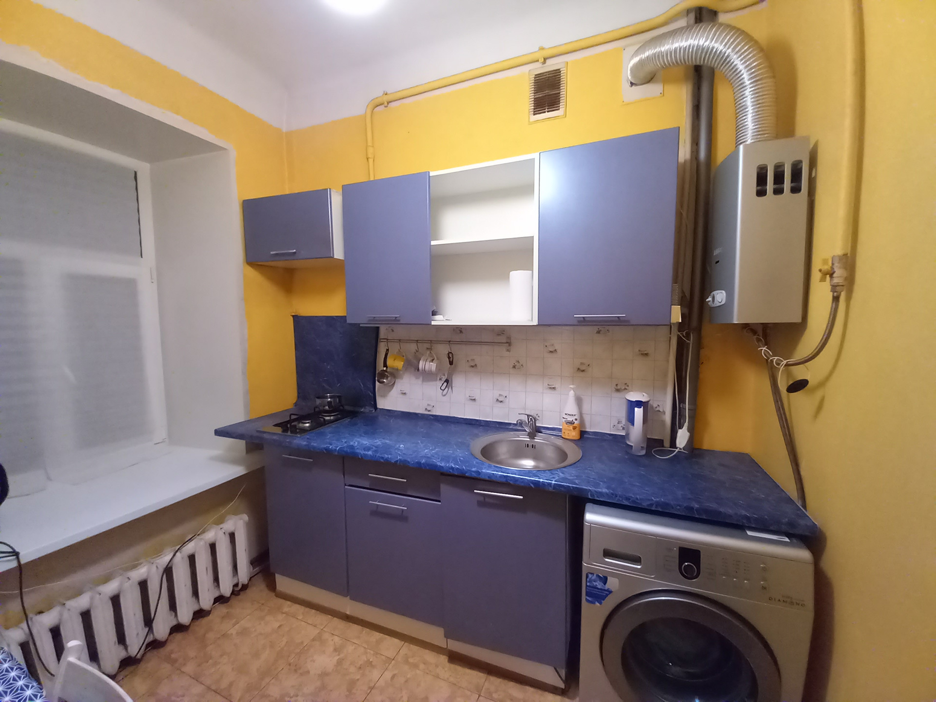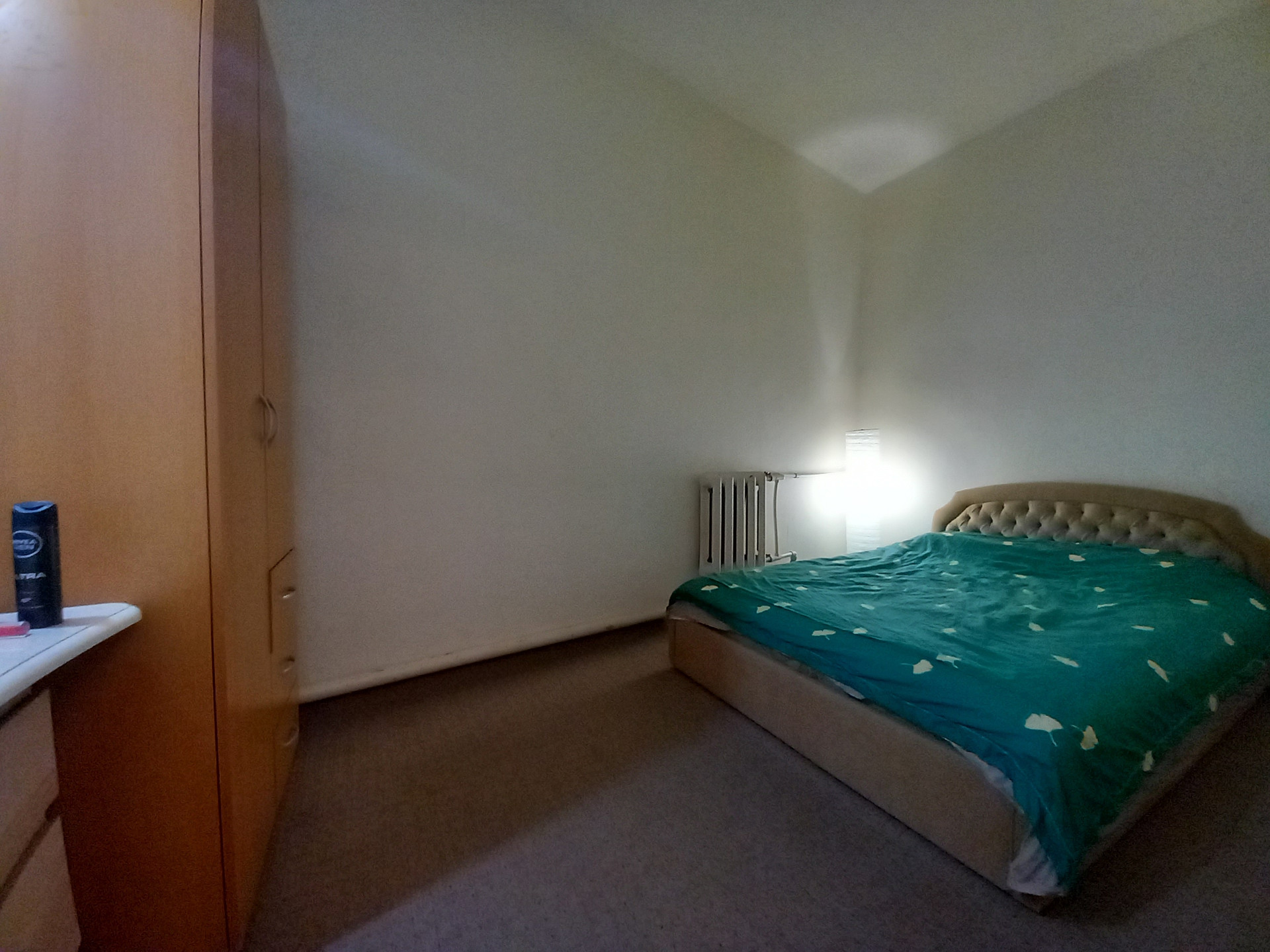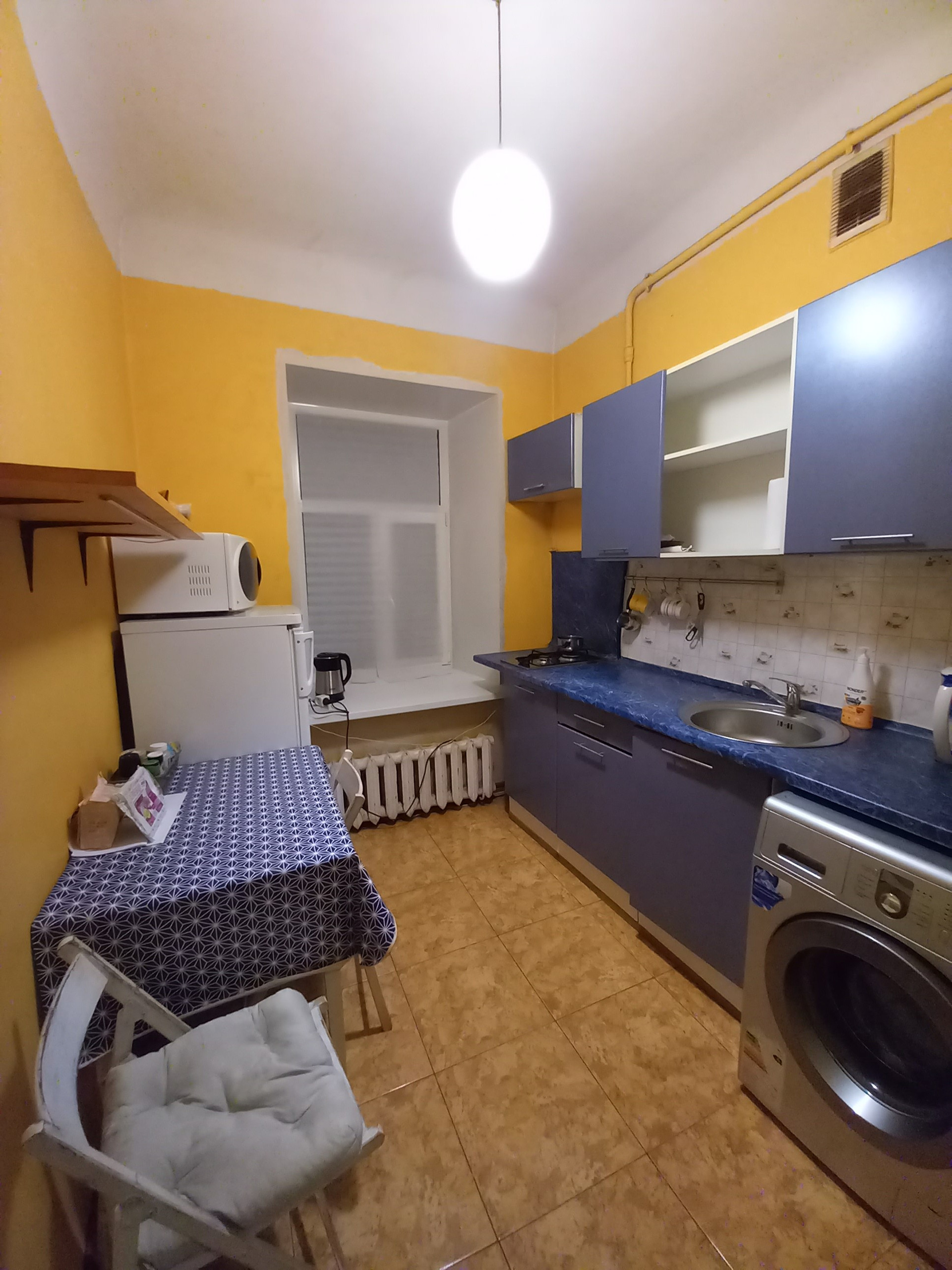 Квартира дворовая, высокий первый этаж ( в окна с улицы не заглянуть), одна квартира на этаже. Комната большая, искусственно поделена на две зоны: гостинная и спальня. Теплая, батареи большие, стены толстые, на окнах стеклопакеты. Ремонт косметический. Встречная покупка.