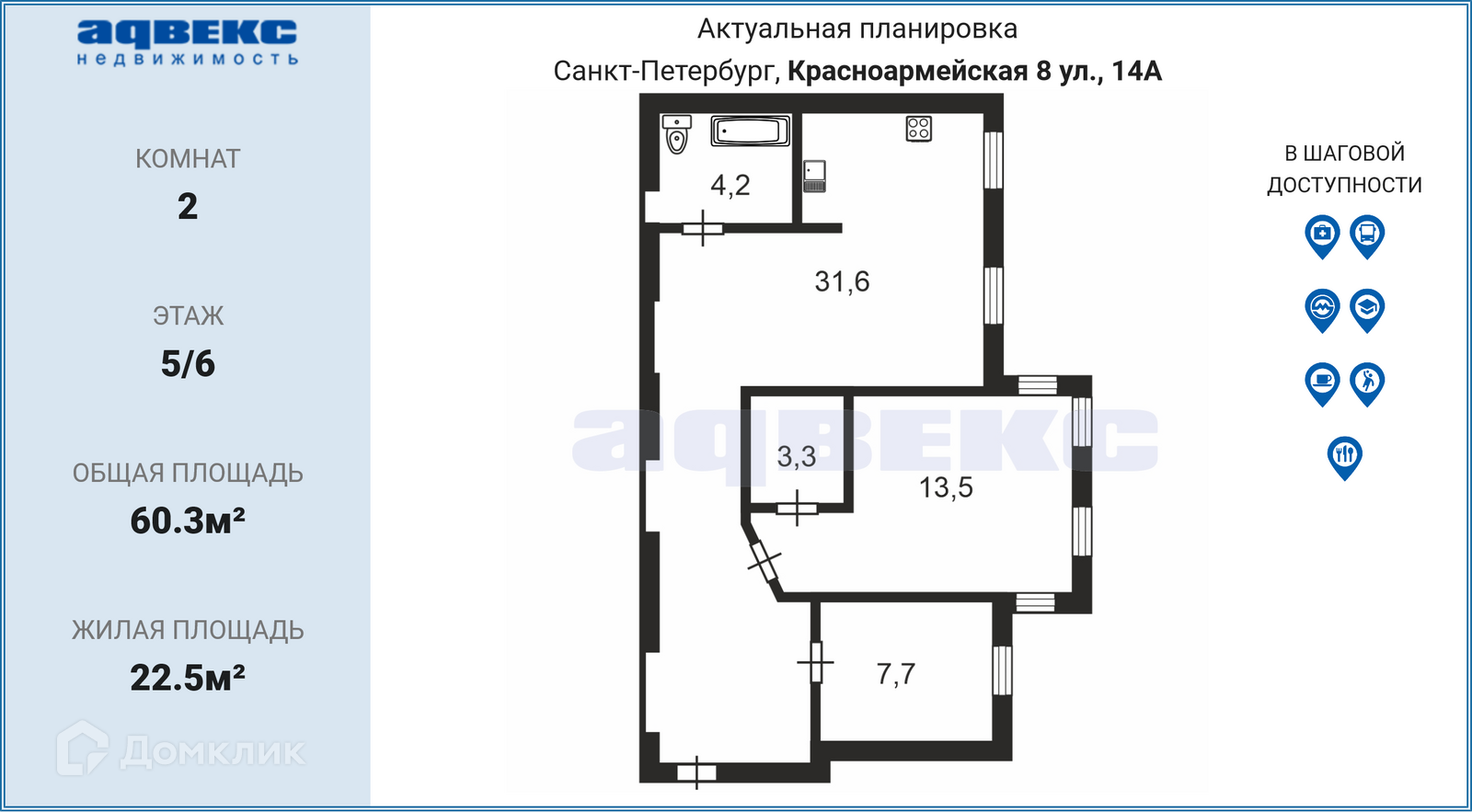 2-комнатная квартира, 60.3 м2, этаж 5 / 6, на продажу в Санкт-Петербурге, 8-я Красноармейская улица, 14