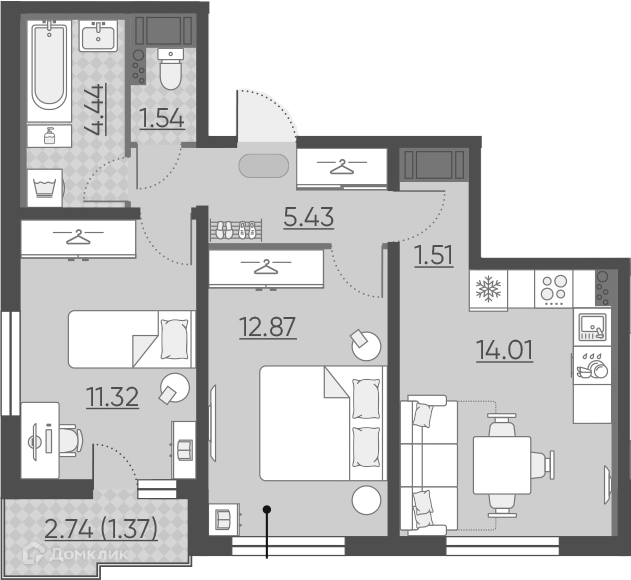 Общая площадь 52.49 м2