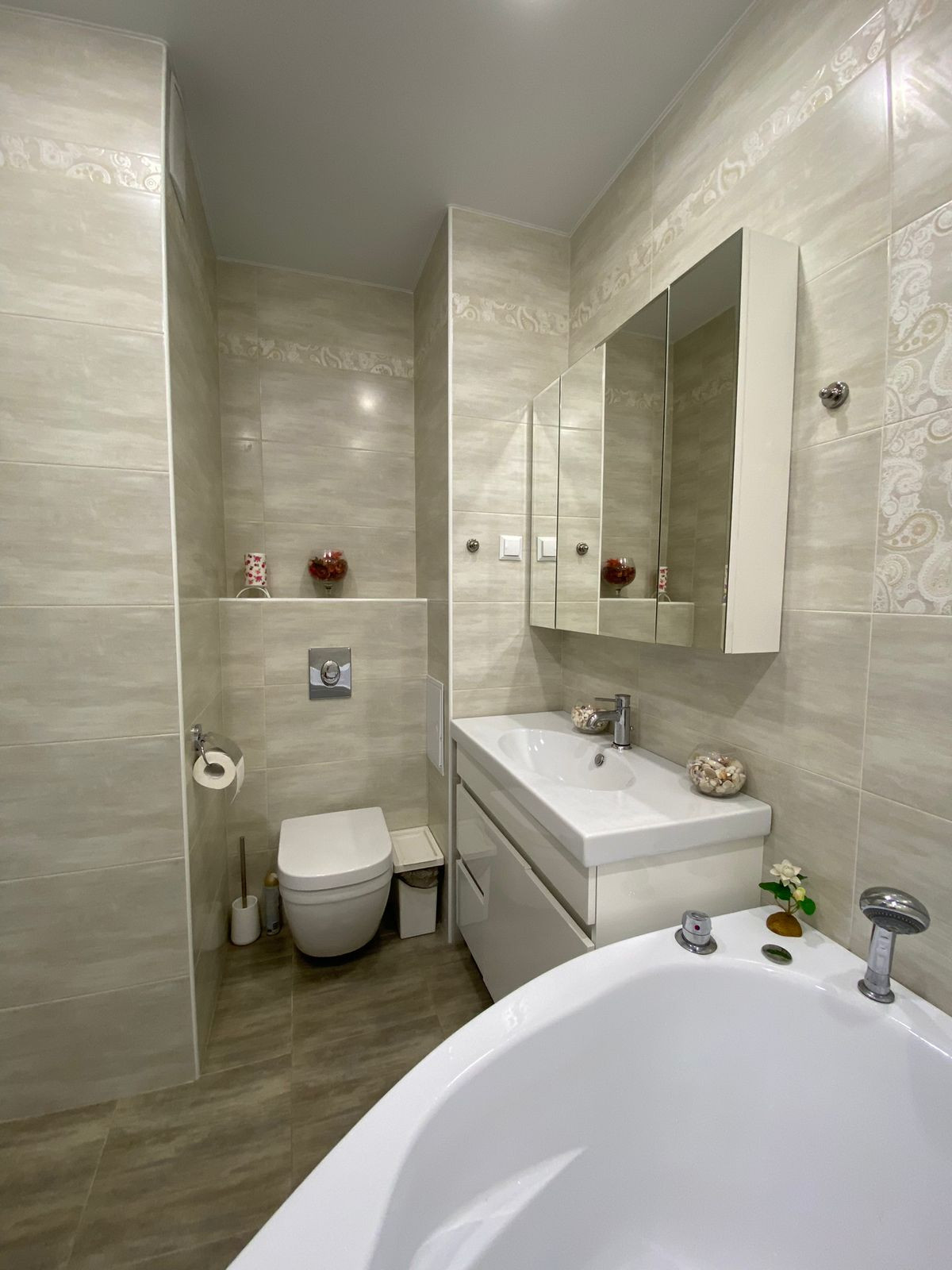 Выполнен качественный ремонт: сделана звукоизоляция (соседей не слышно), в комнатах итальянские моющиеся обои, поменян ламинат, натяжные потолки, в с/узле качественная отделка и дорогая с/техника.