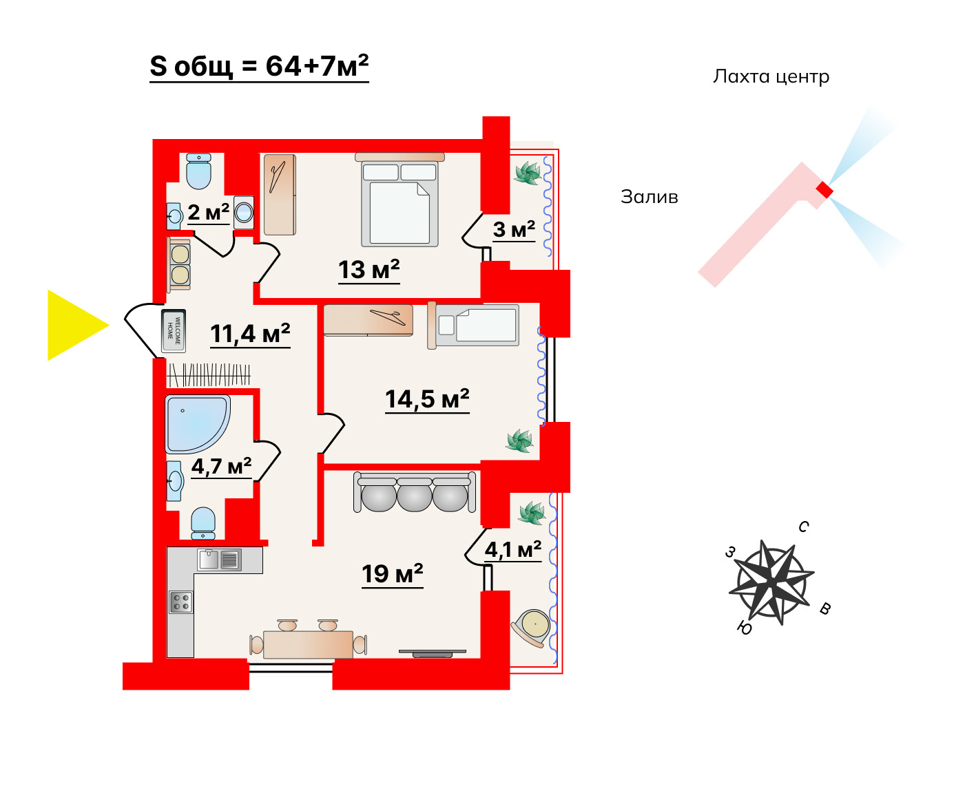 Комфортная планировка - кухня-гостиная + 2 спальни, 2 отдельных просторных с/узла, 2 видовых лоджии, большой коридор. Общая площадь 64,5м + 7м лоджии