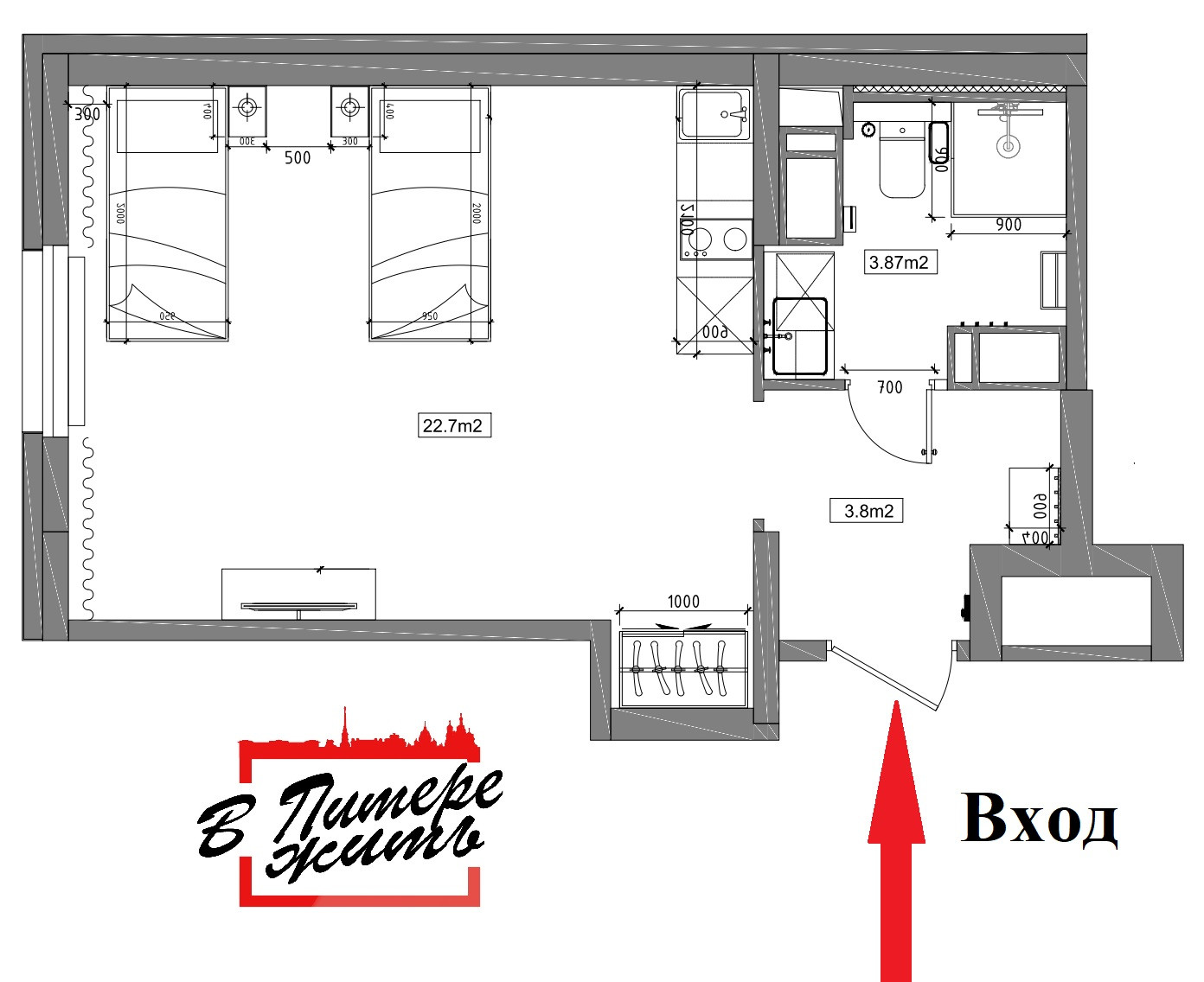 Жилая площадь 22.7 м2