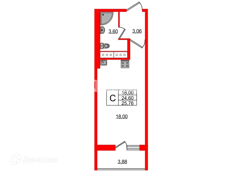 Общая площадь 24.6 м2