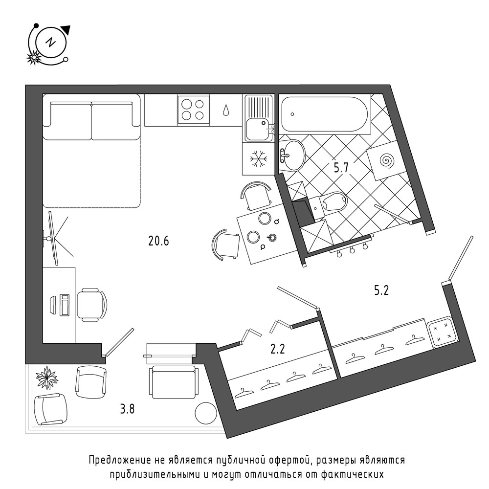 Общая площадь 33.8 м2