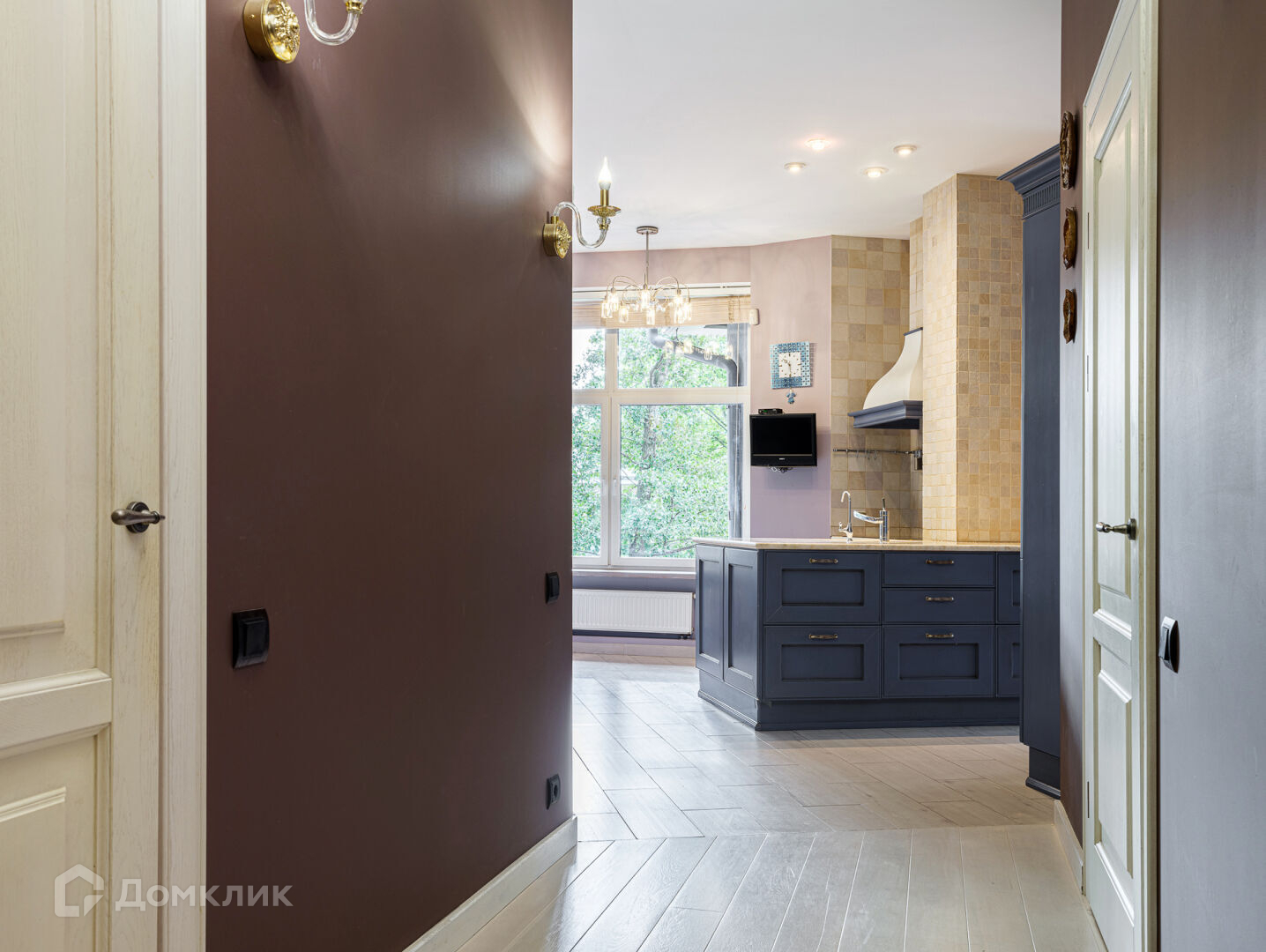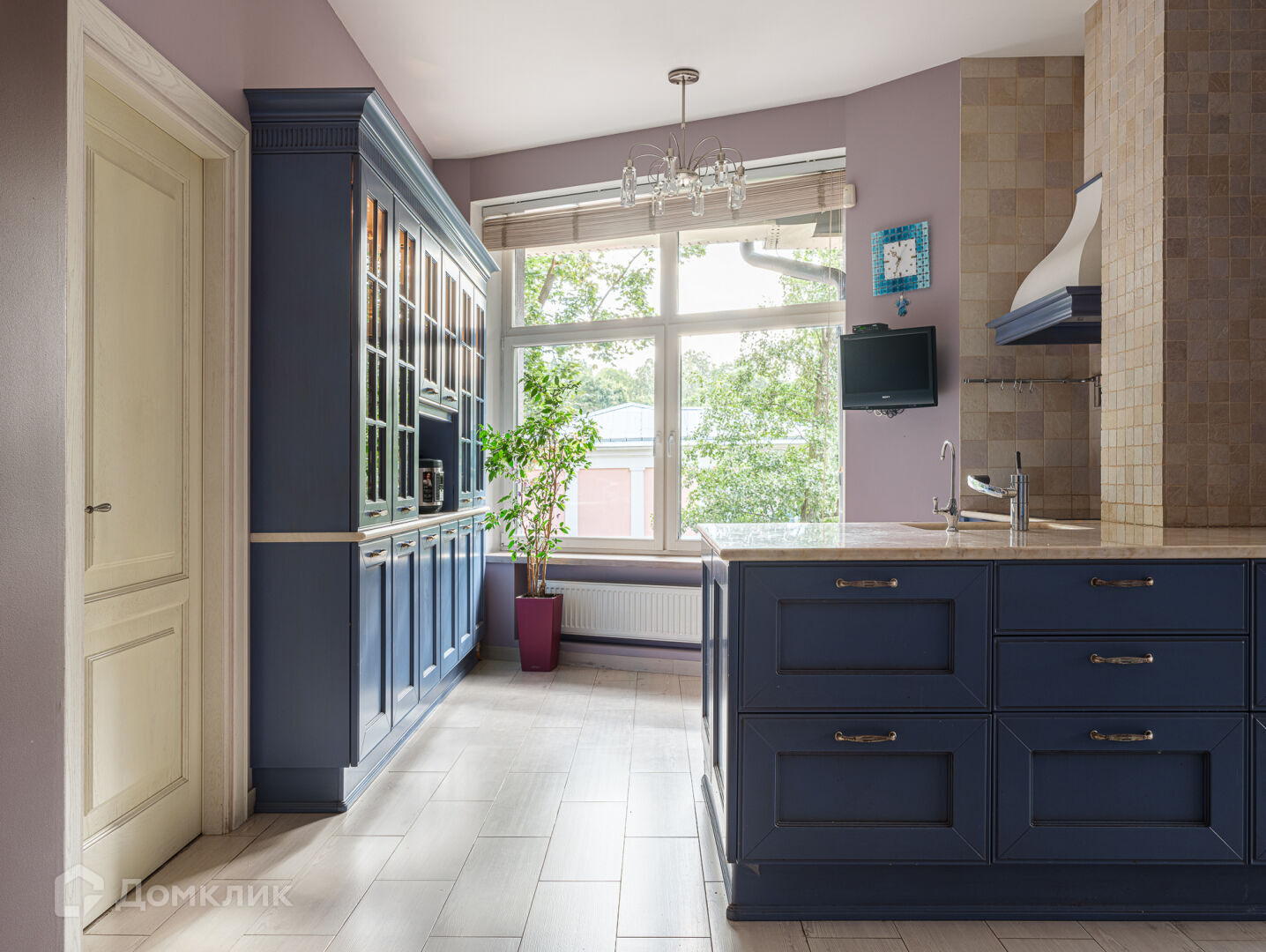 В квартире просторная и функциональная кухня. Итальянская мебель на кухне выполнена из натурального дерева и оборудована техникой премиум-сегмента. Два холодильника-морозильника с приготовлением льда, 5-ти конфорочная индукционная плита, посудомоечная машина, трёхуровневая система фильтрации воды, столешницы выполнены из натурального мрамора. Уютная спальня так же обращена окнами на зелень парка. Полное ощущение, что Вы находитесь за городом. К спальне примыкает удобная гардеробная. Еще одна гардеробная, для верхней одежды, есть у входа в квартиру. Полы в квартире — сочетание белёного дуба и керамической плитки.