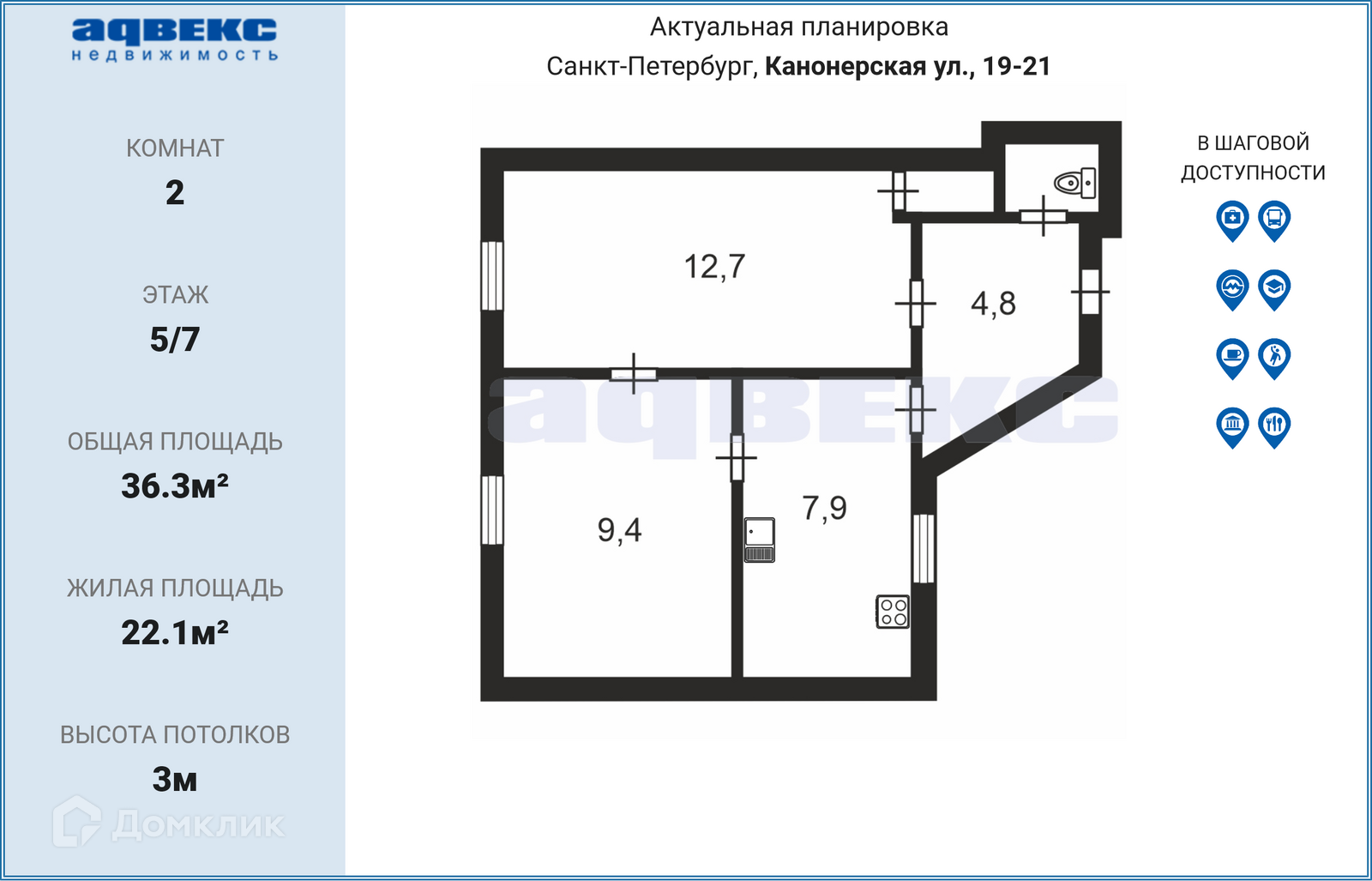 Общая площадь 36.3 м2