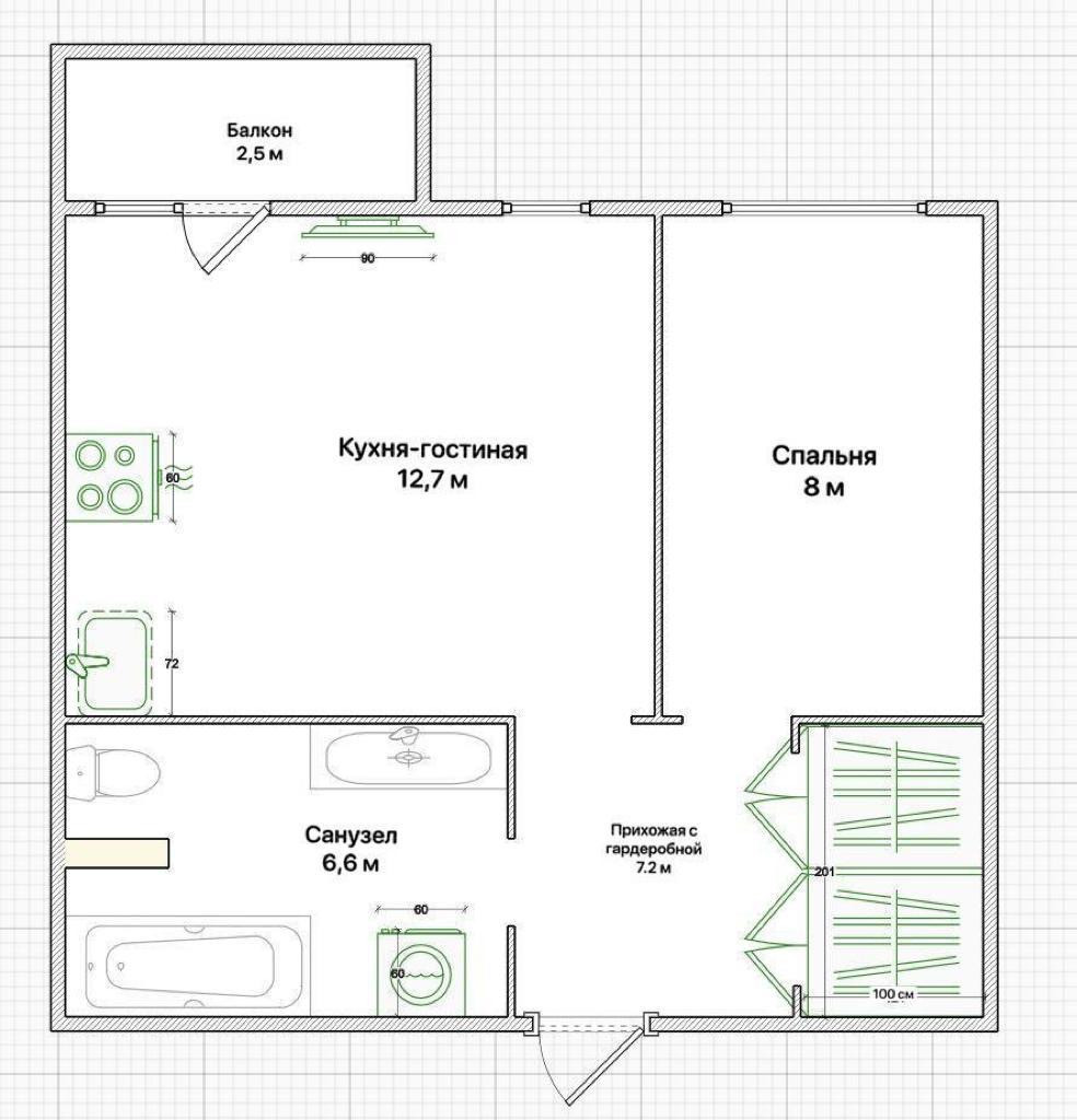 Парк Сосновка, парк Бенуа. Кухня-гостиная 12,7 м2, СУ 6,6 м2, Прихожая 7,2 м2. Гардеробная 2м2, Спальня 8 м2