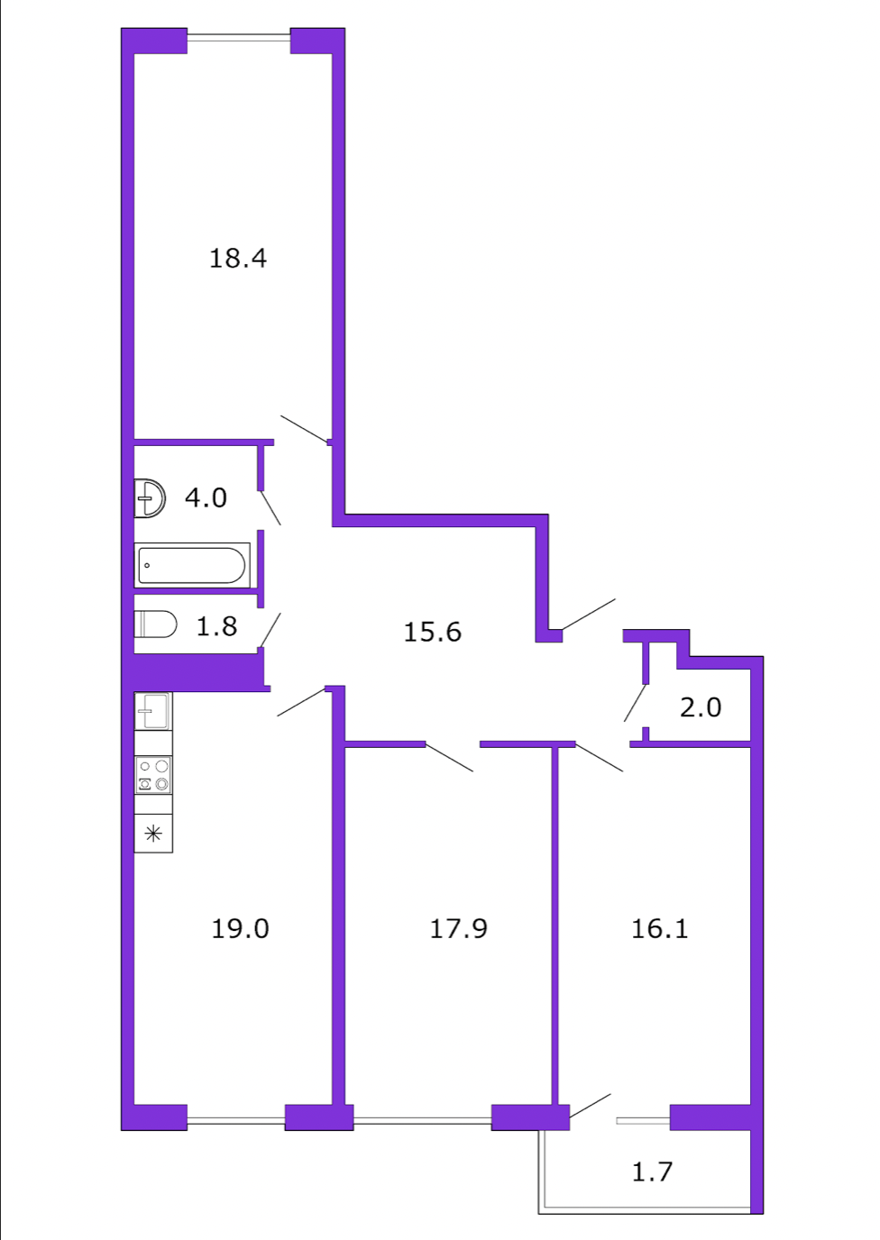 Эргономичная планировка, 3 полноценных изолированных комнаты - спальня родителей -18 м2, детская с оборудованной гардеробной - 16 м2, вторая детская- 18,4 м2, застеклённый балкон.