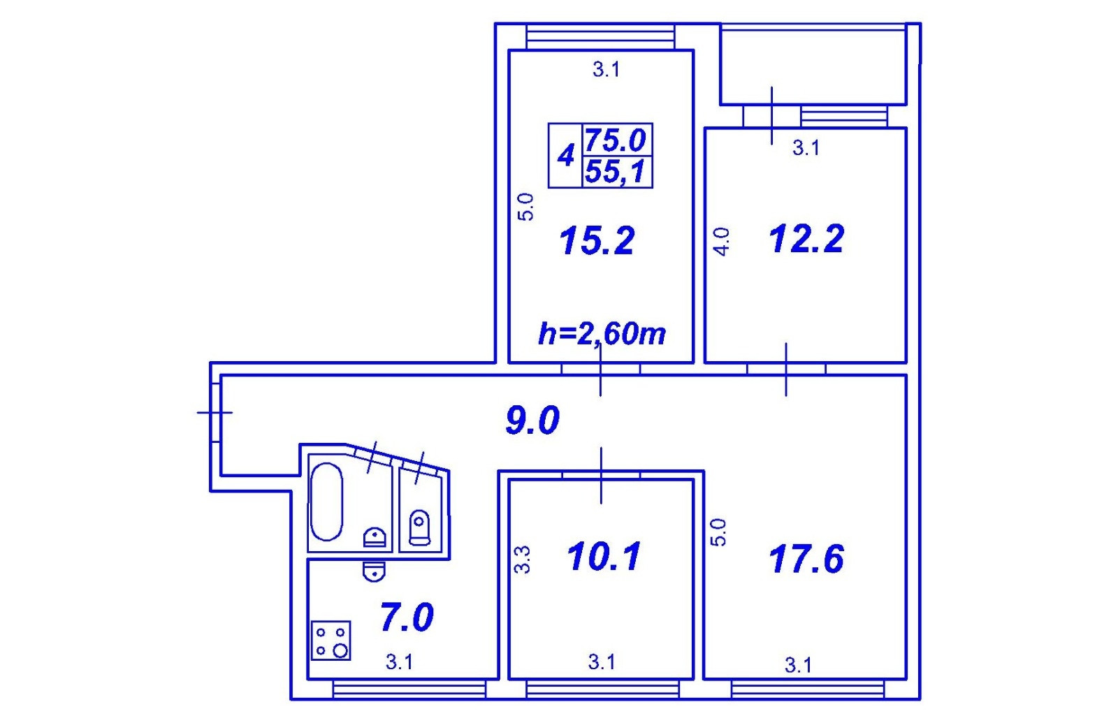 Жилая площадь 55.1 м2