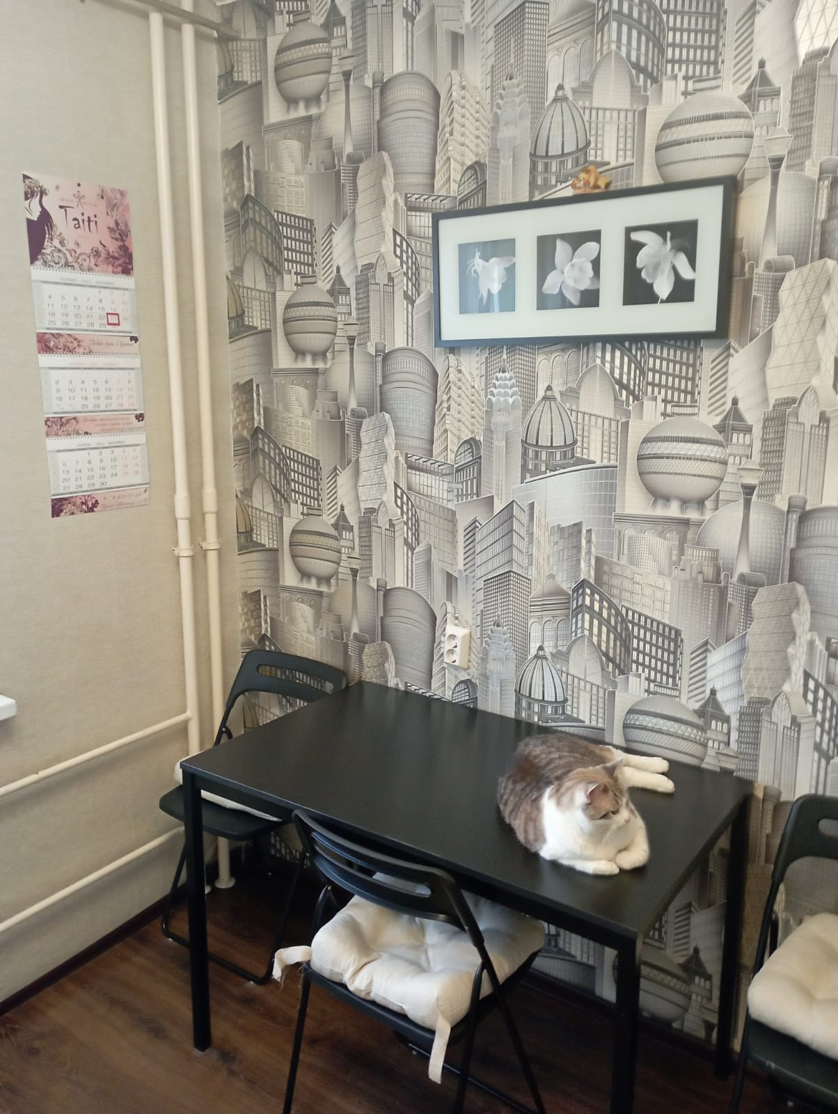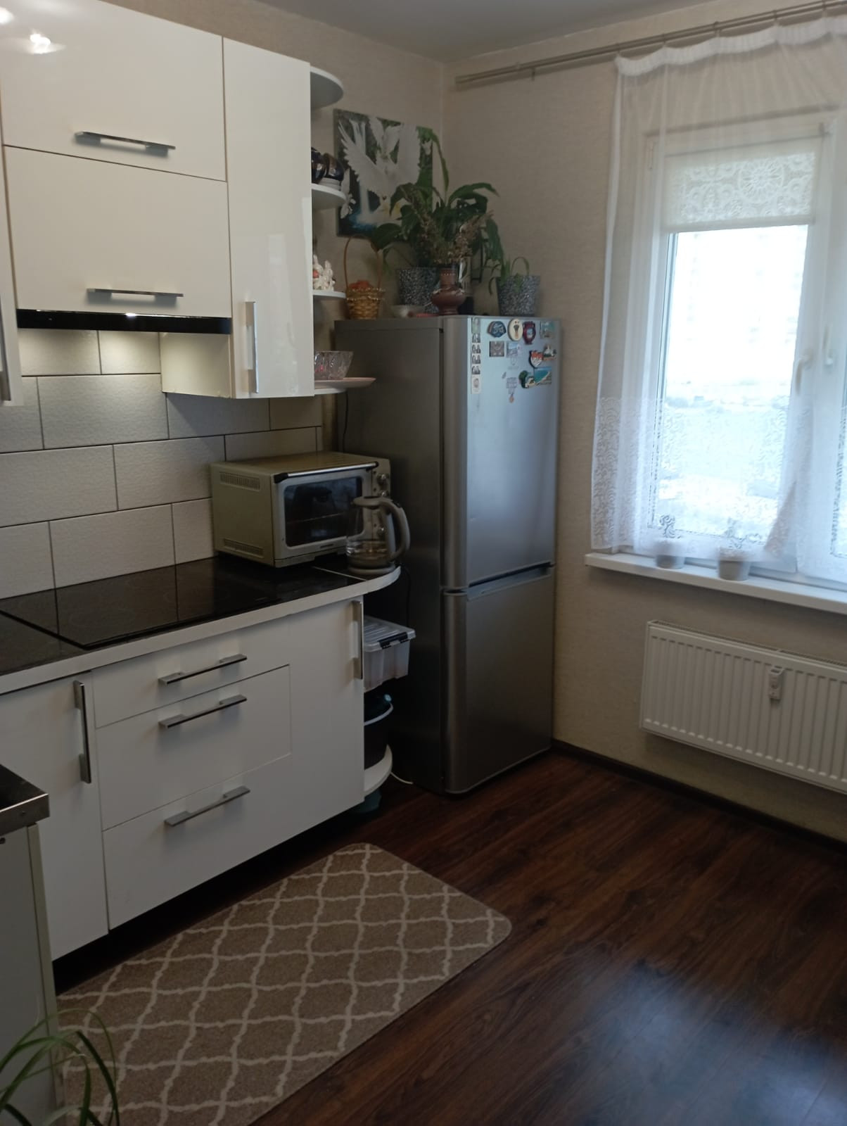 Прихожая с гардеробной, раздельный санузел с большой ванной комнатой (3,2 м2). Просторная кухня 9 м2 (Остается встроенный гарнитур с индукционной плитой).