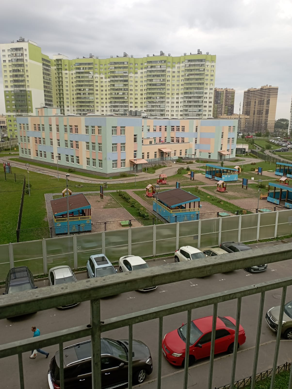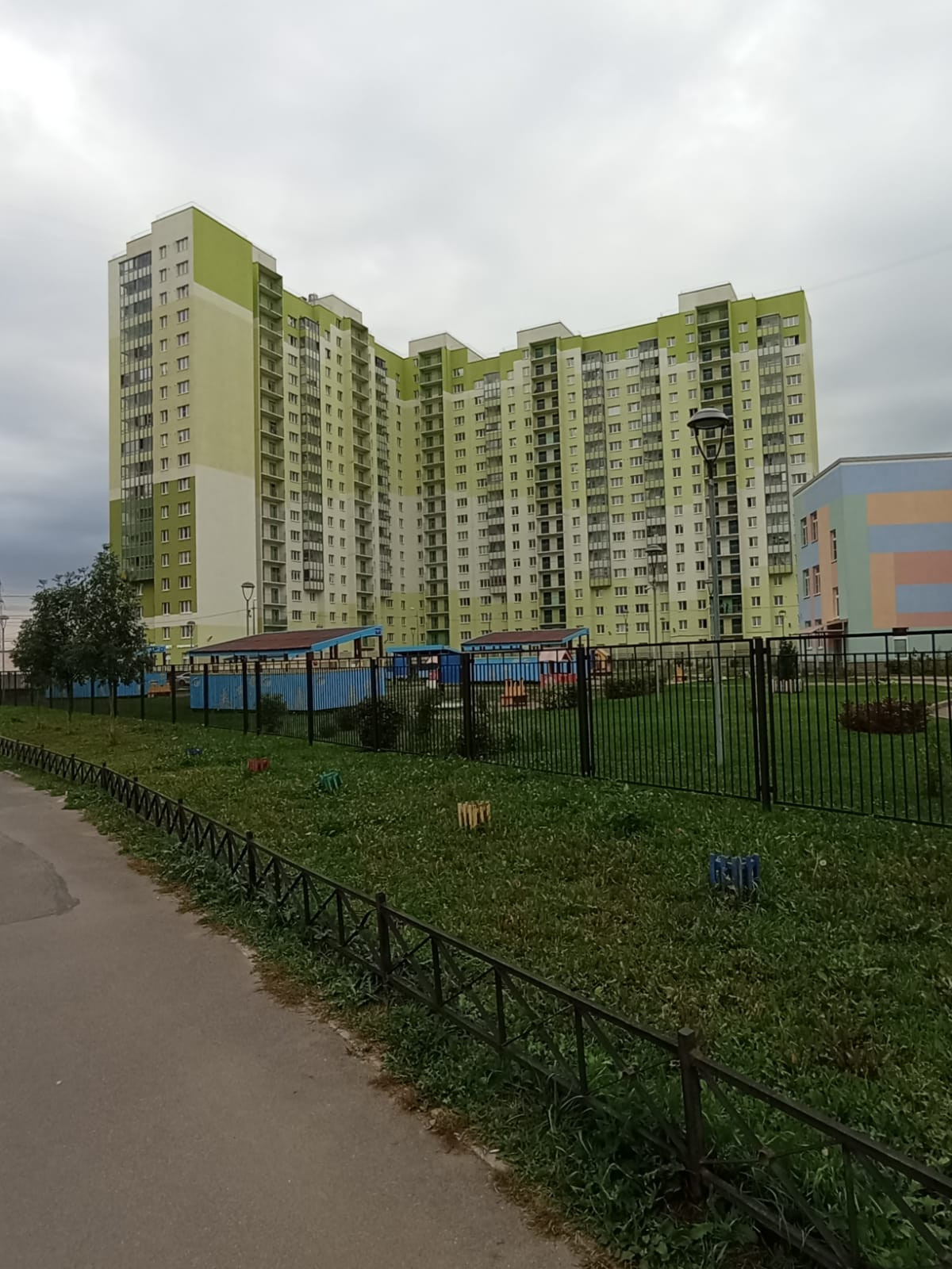 Во дворе детский сад, школа через дорогу, спортзал.