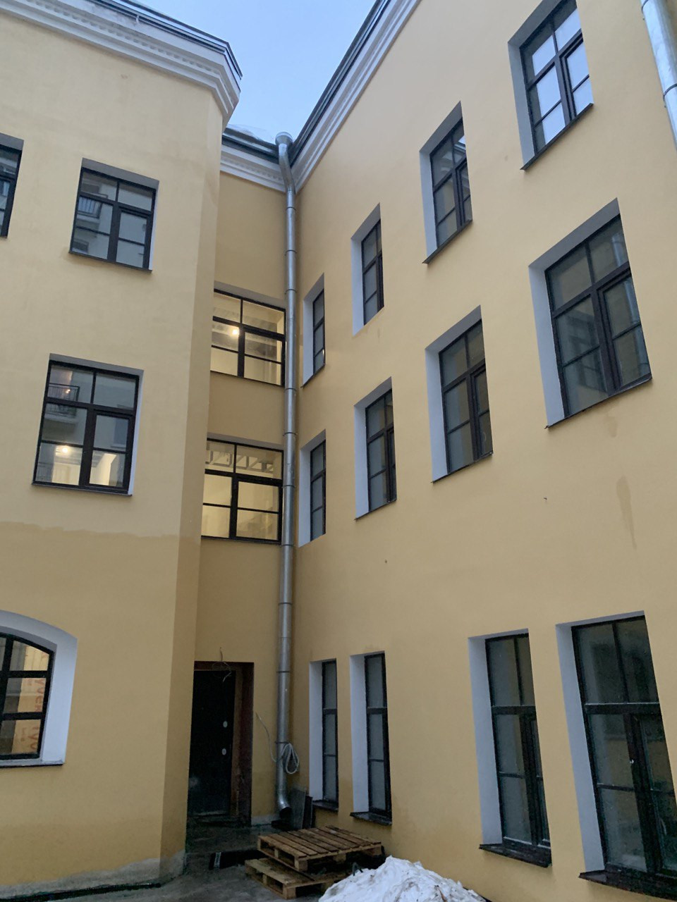 Здание выкрашено в приятный жёлтый цвет, совпадающий с тем, в который ещё 100 лет назад красили большинство жилых домов Петербурга. Он поднимает настроение в пасмурную погоду. Внутри здания располагается уютный дворик, где приятно проводить время. Для обеспечения вашей безопасности по всей территории объекта будут расположены камеры видеонаблюдения.