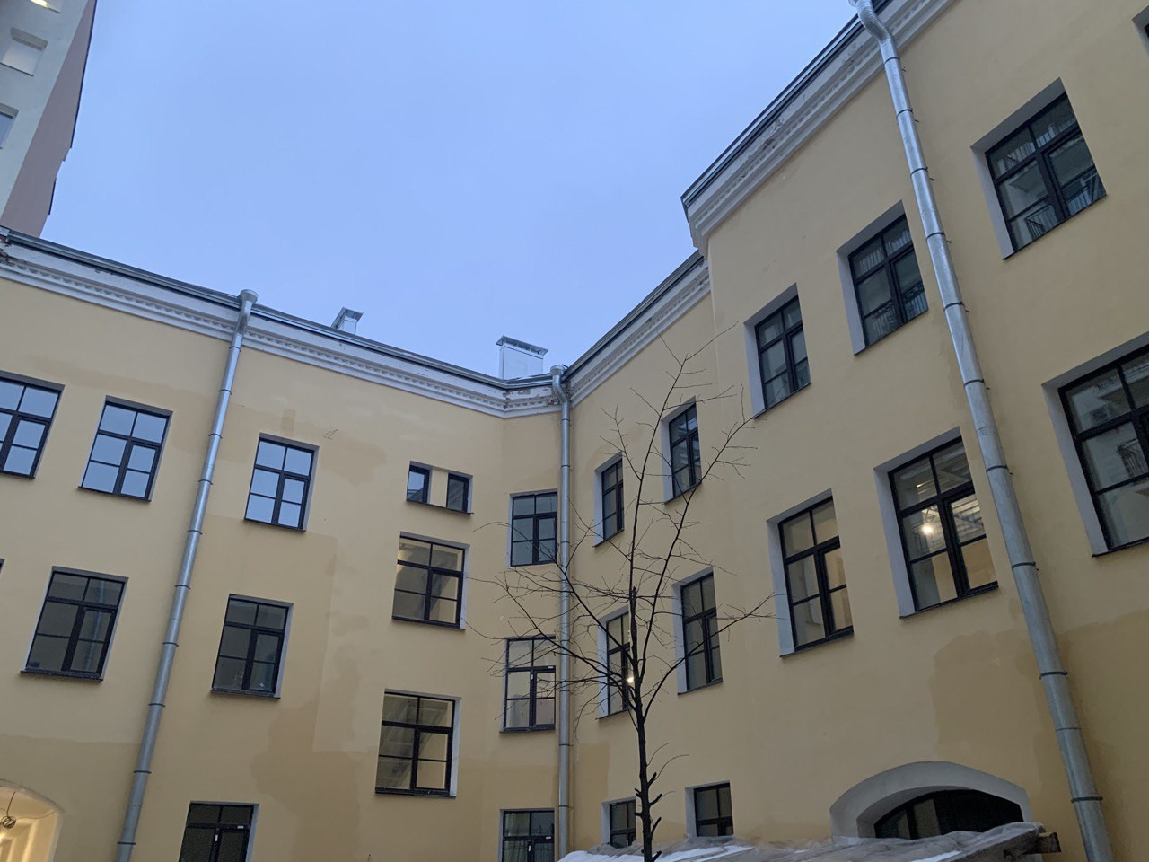 Здание выкрашено в приятный жёлтый цвет, совпадающий с тем, в который ещё 100 лет назад красили большинство жилых домов Петербурга. Он поднимает настроение в пасмурную погоду. Внутри здания располагается уютный дворик, где приятно проводить время. Для обеспечения вашей безопасности по всей территории объекта будут расположены камеры видеонаблюдения.