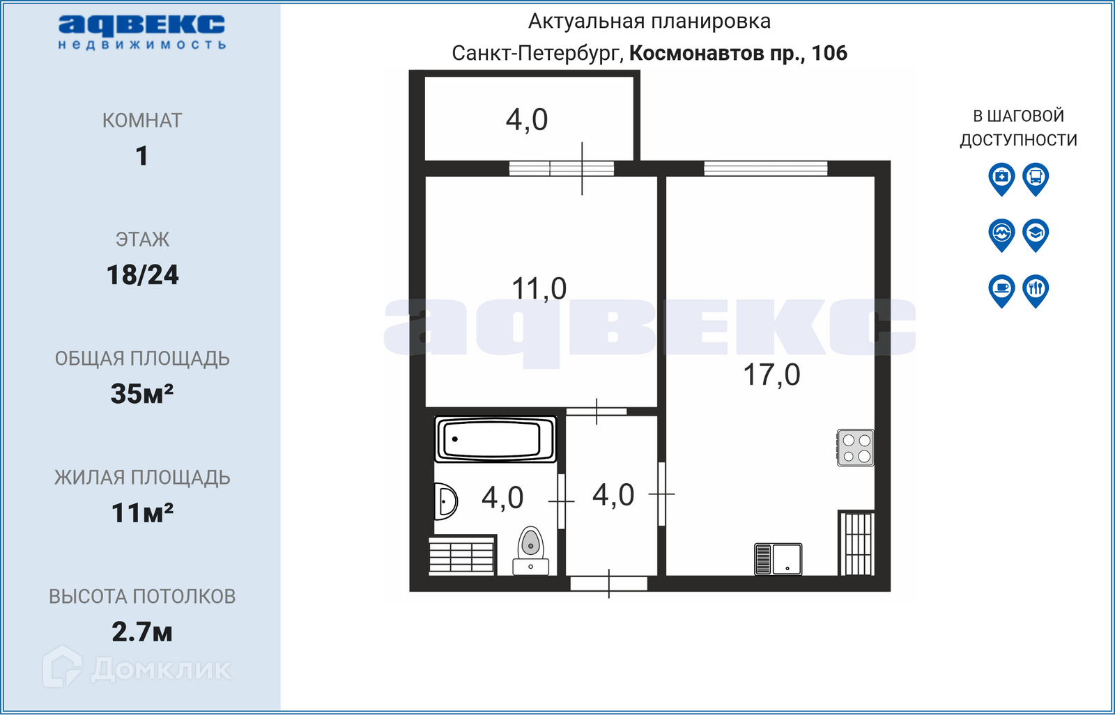 1-комнатная квартира, 35 м2, этаж 18 / 24, на продажу в Санкт-Петербурге, проспект Космонавтов, 106