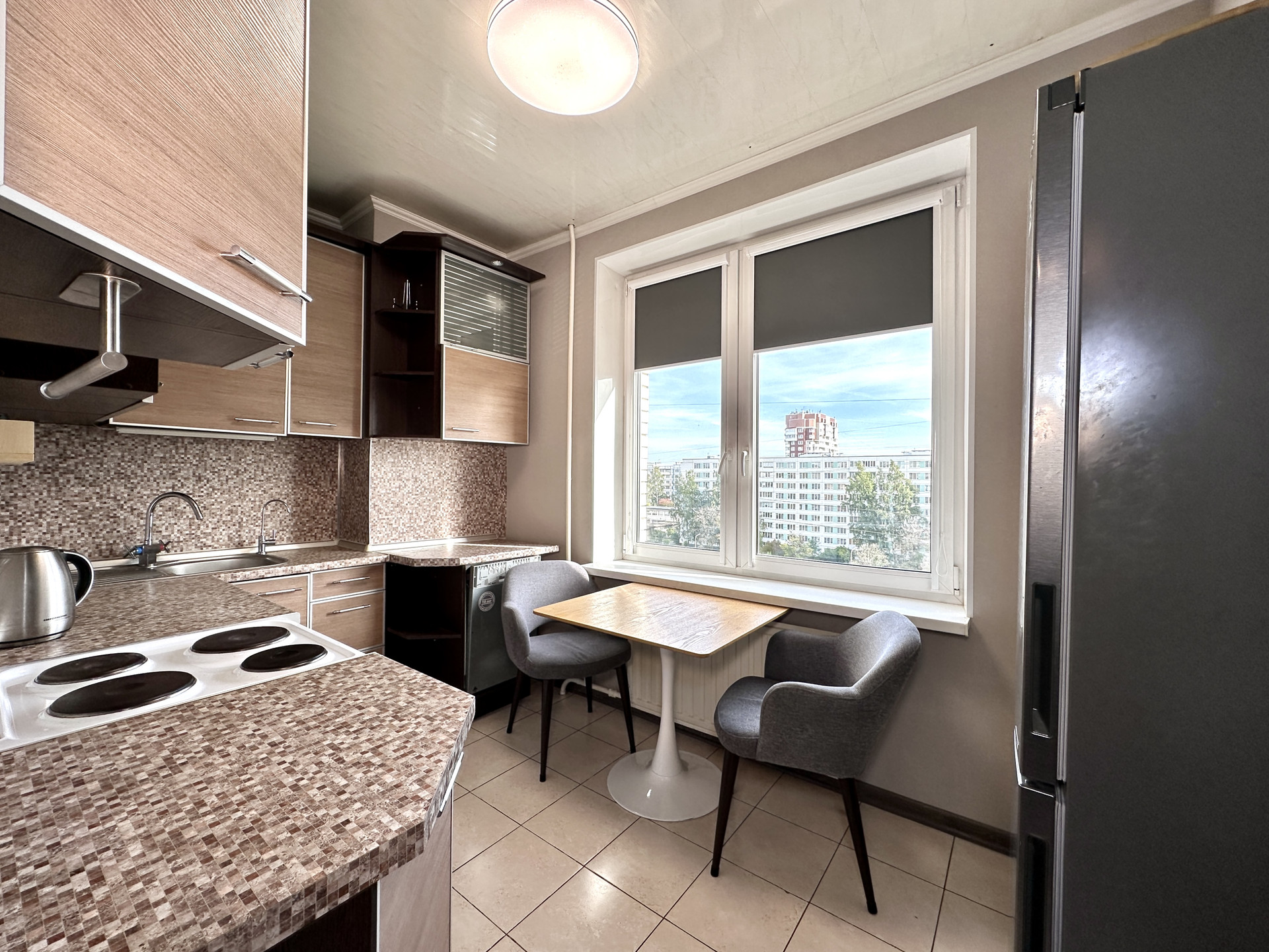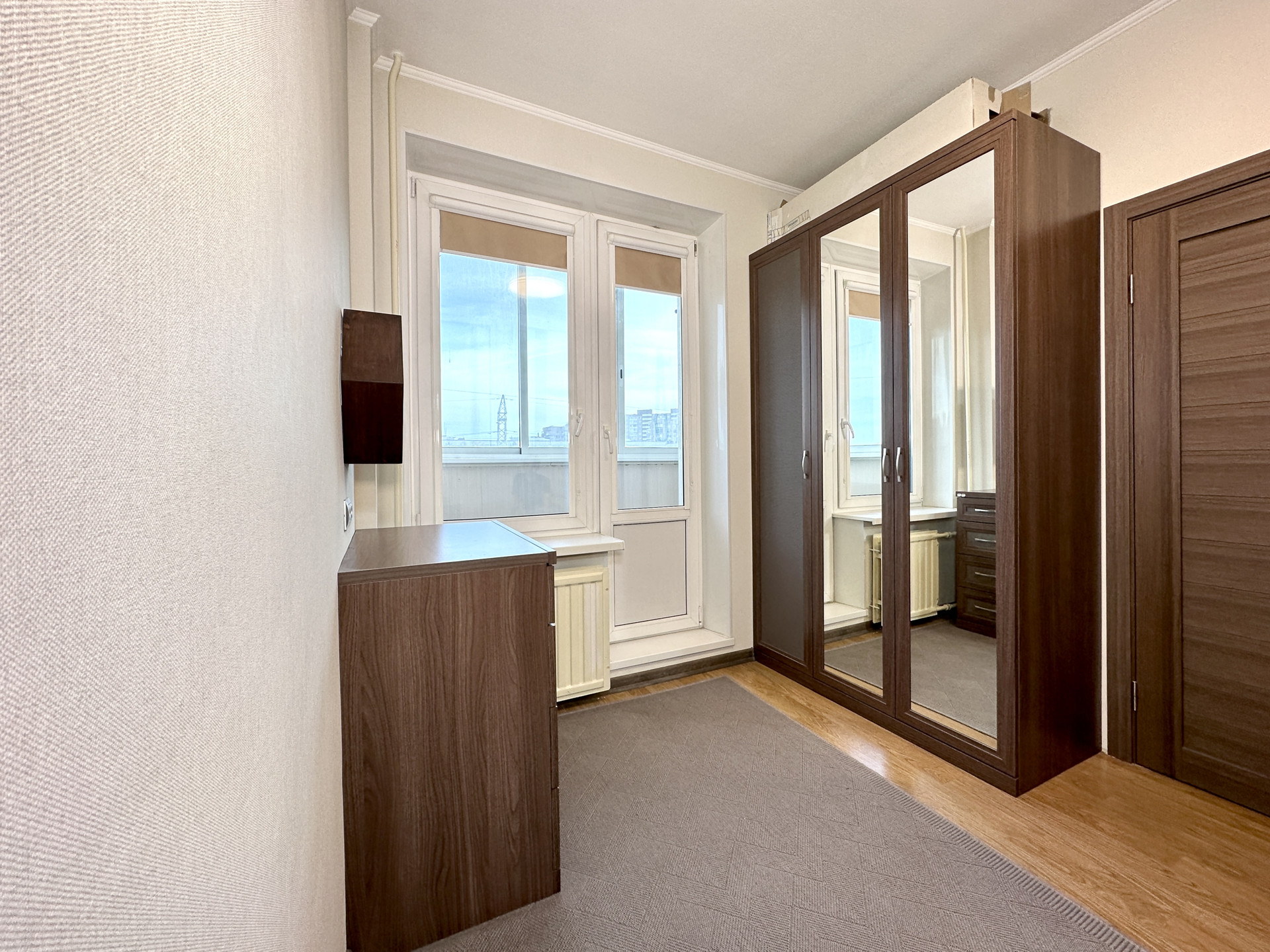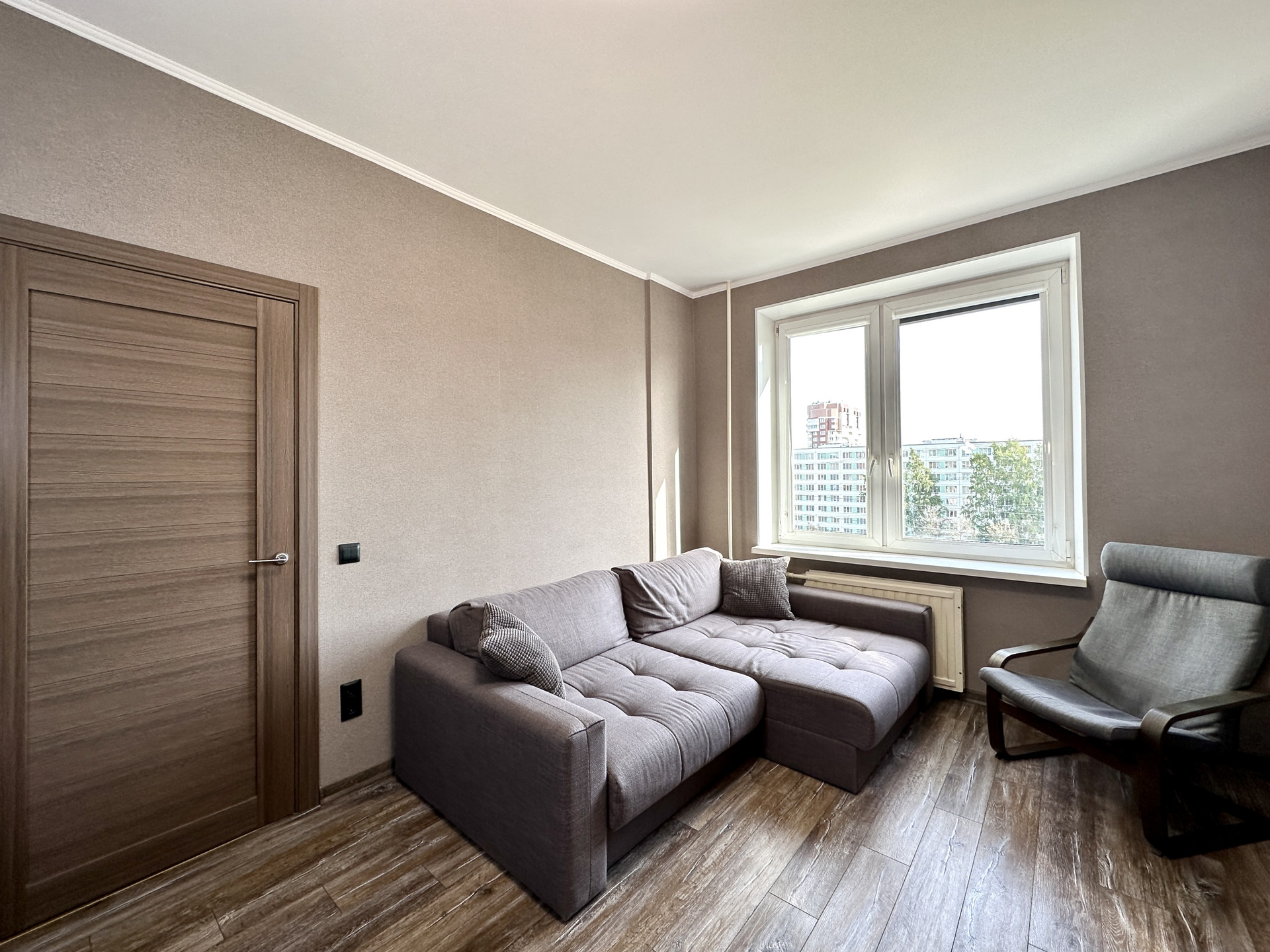 ОТДЕЛКА: Сделан косметических ремонт: моющиеся обои во всей квартире в пастельных нейтральных тонах, заменены двери во всех комнатах, новый ламинат в гостиной.Санузел раздельный. Рулонные блэкаут шторы на всех окнах. На кухне и в коридоре плитка с теплым электрическим полом с отдельными регуляторами для каждой комнаты.