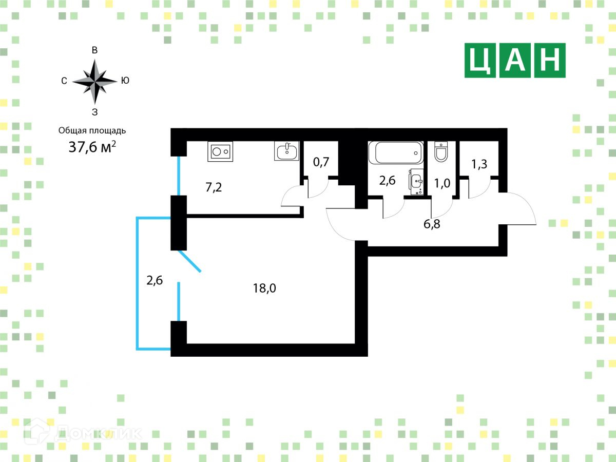 Общая площадь 37.6 м2