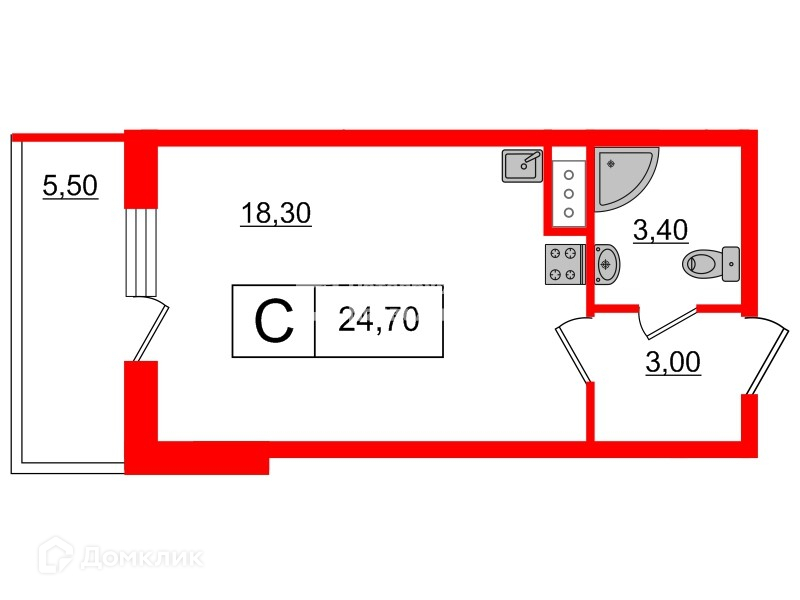 Общая площадь 24.7 м2