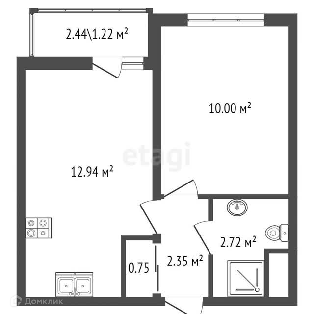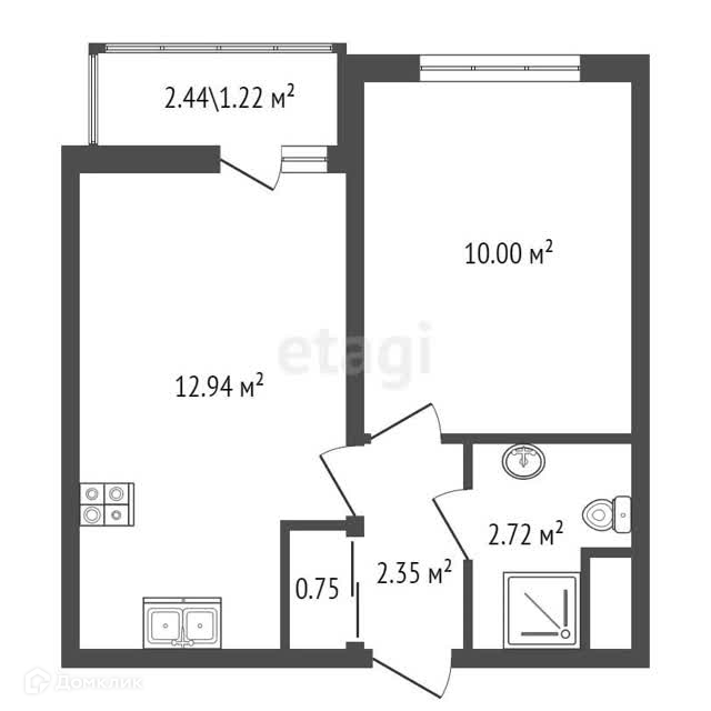 Комната:10 м² Кухня: 12,94 м² Санузел: 3,2 м² Холл: 2,5 м² Высота потолков: 2,57 м.