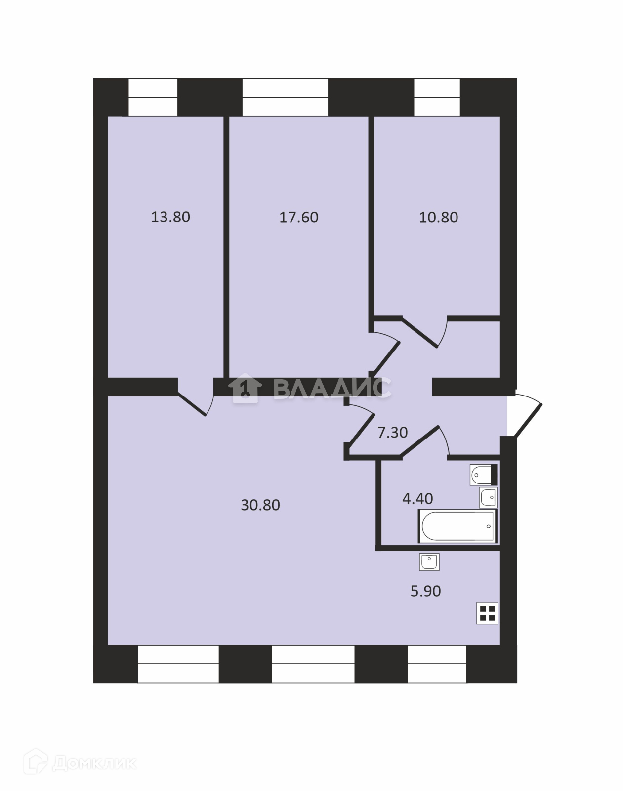Общая площадь квартиры составляет 90,6 кв.метров.
