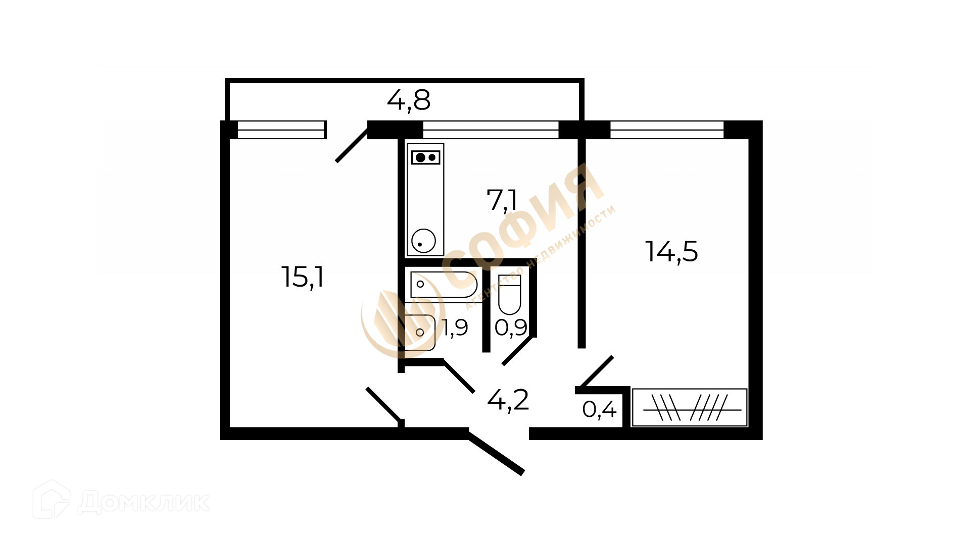 Жилая площадь 29.6 м2