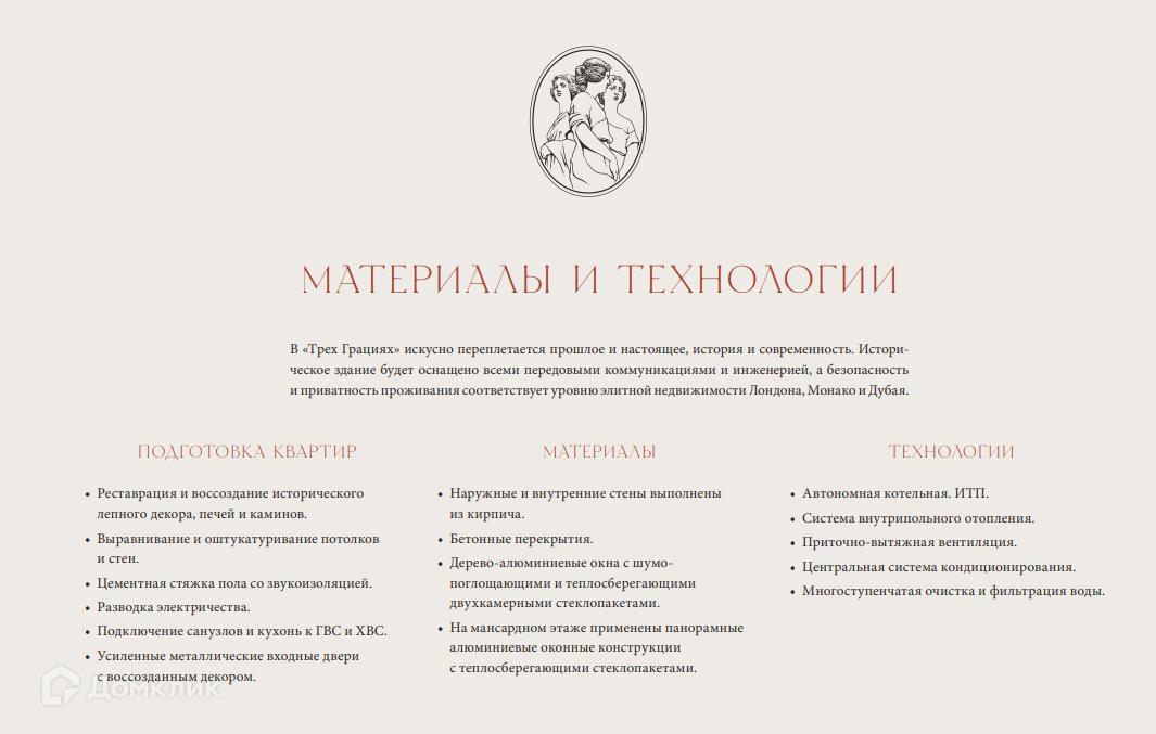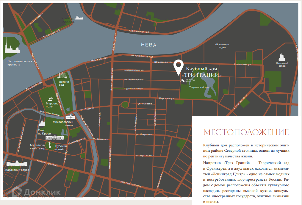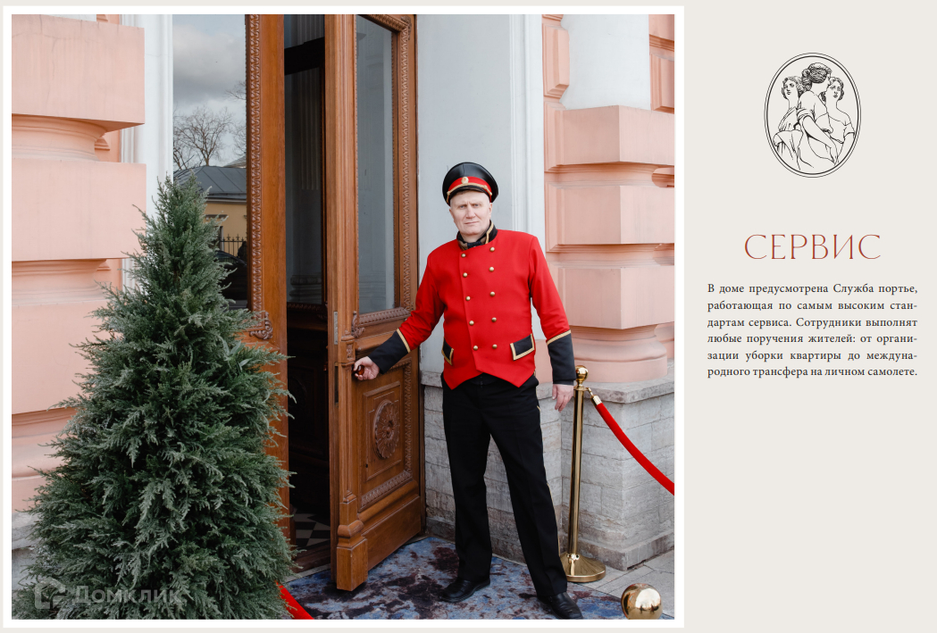 Арт. 52658039 Клубный дом «Три Грации» – великолепный архитектурный памятник Санкт-Петербурга с богатейшей историей, расположенный напротив Таврического сада в окружении объектов всемирного наследия. Доходный дом был создан в стиле необарокко в 1906-1907 годах архитектором Вильгельмом Ван-дер-Гюхтом для прусского подданного Карла Шрейбера. До революции здесь проживали депутаты Первой городской Думы, сенаторы, высшие офицерские чины армии Российской империи, а часть помещений занимало посольство Норвегии. Свое изящное название клубный дом получил в честь трех дочерей бога Зевса – Граций, каждая из которых является олицетворением юности, красоты и привлекательности. Скульптура трех Граций является неотъемлемой частью архитектурного ансамбля и установлена на пересечении Захарьевской и Потемкинской улиц. Фасады и внутренние пространства дома неповторимы и уникальны: кариатиды и атланты, гирлянды и вазы, эркеры, ризалиты, кованые решетки ограждений лифтов, лепнина и декоративные проемы. В доме расположены просторные представительские резиденции класса De Luxe с большими светлыми окнами, высокими потолками и просторными планировками, в которых бережно сохранены исторические элементы отделки и декора. Первые этажи дома займут объекты собственной премиальной инфраструктуры, а служба сервиса обеспечит абсолютную безопасность и приватность проживания.