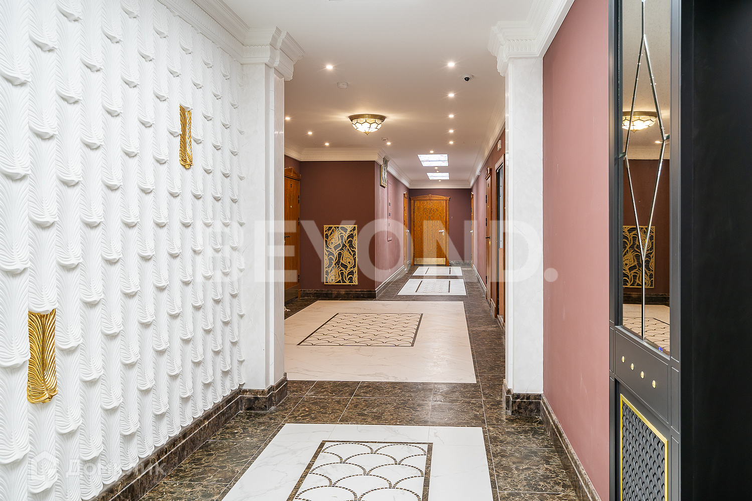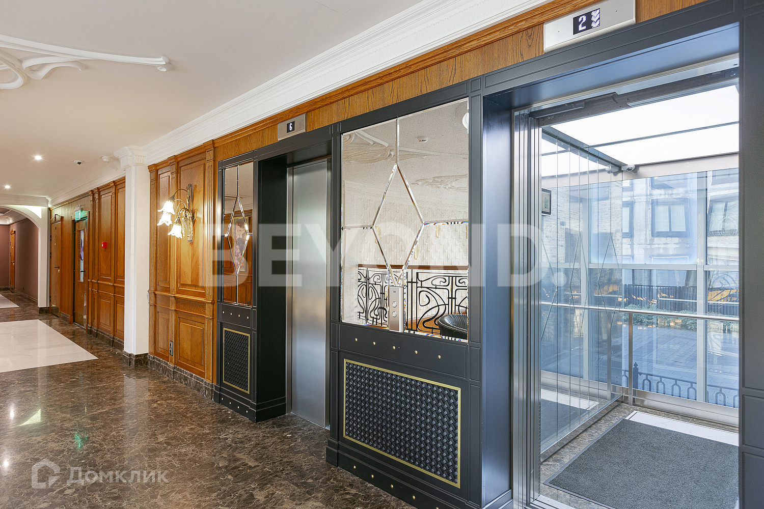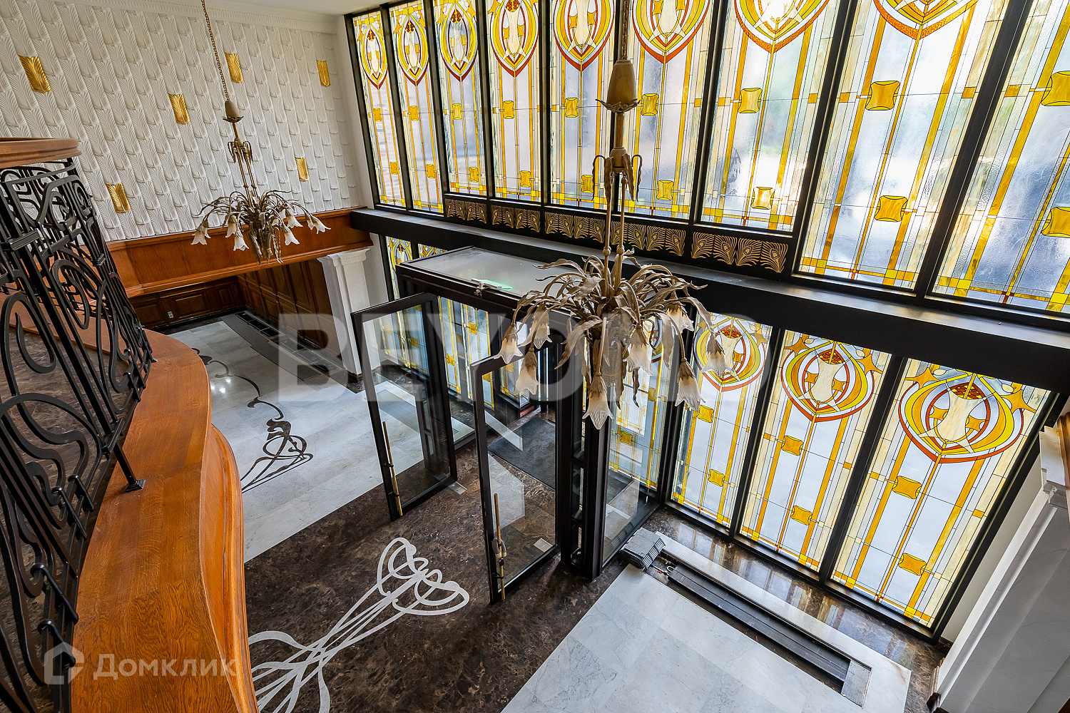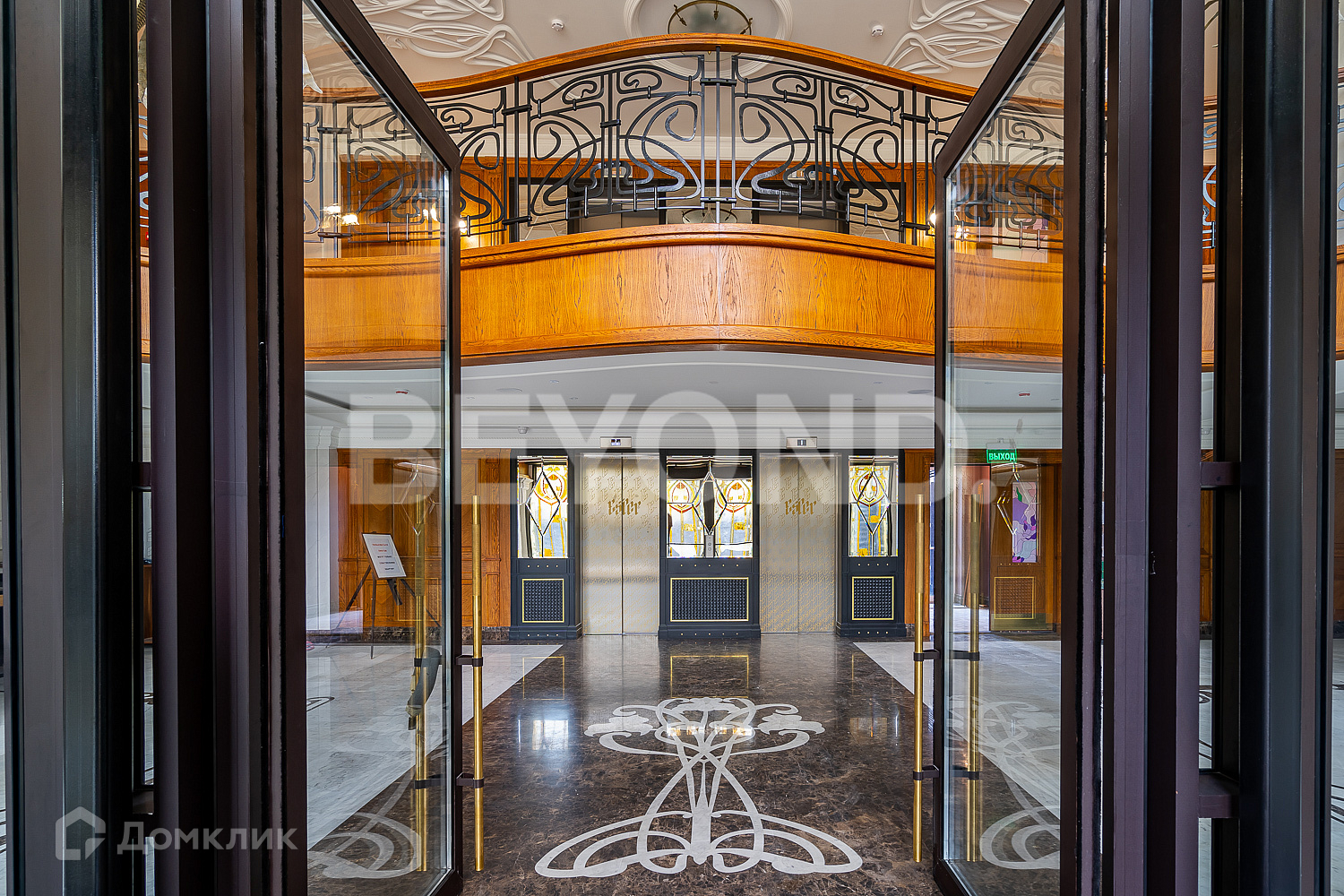 Интерьер двухуровневой входной группы и пространства лобби выполнен в стиле арт-нуво. Главные украшения лобби - широкие резные двери и панорамные витражные окна. Второй уровень оформлен узорным кованым ограждением. Дополняют интерьер скульптуры, большая кованая люстра и дровяной камин в зоне отдыха.