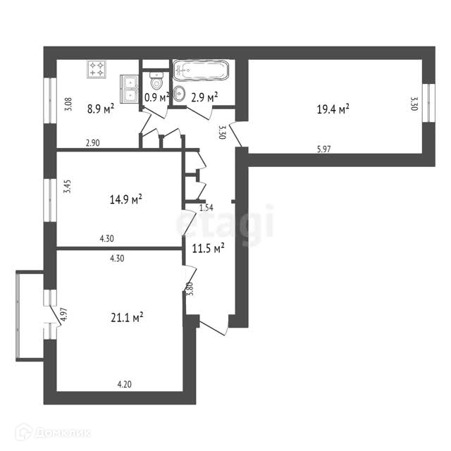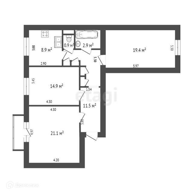 Функциональная планировка включает в себя светлую кухню площадью 8,9 м2, изолированные комнаты на две стороны (19,7 м2, 14,9 м2, 21,1 м2 с балконом) и раздельный санузел.